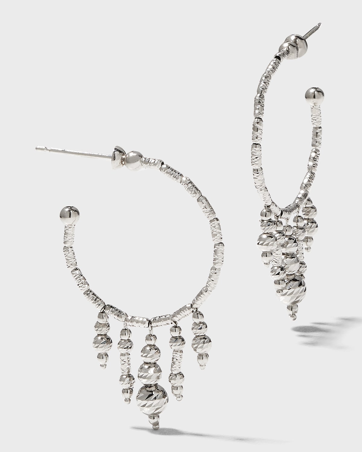 Platinum Born earrings Approx. 1.26"L drop; 0.79" diameter Platinum hoops and handassembled fringe For pierced ears Made in Japan