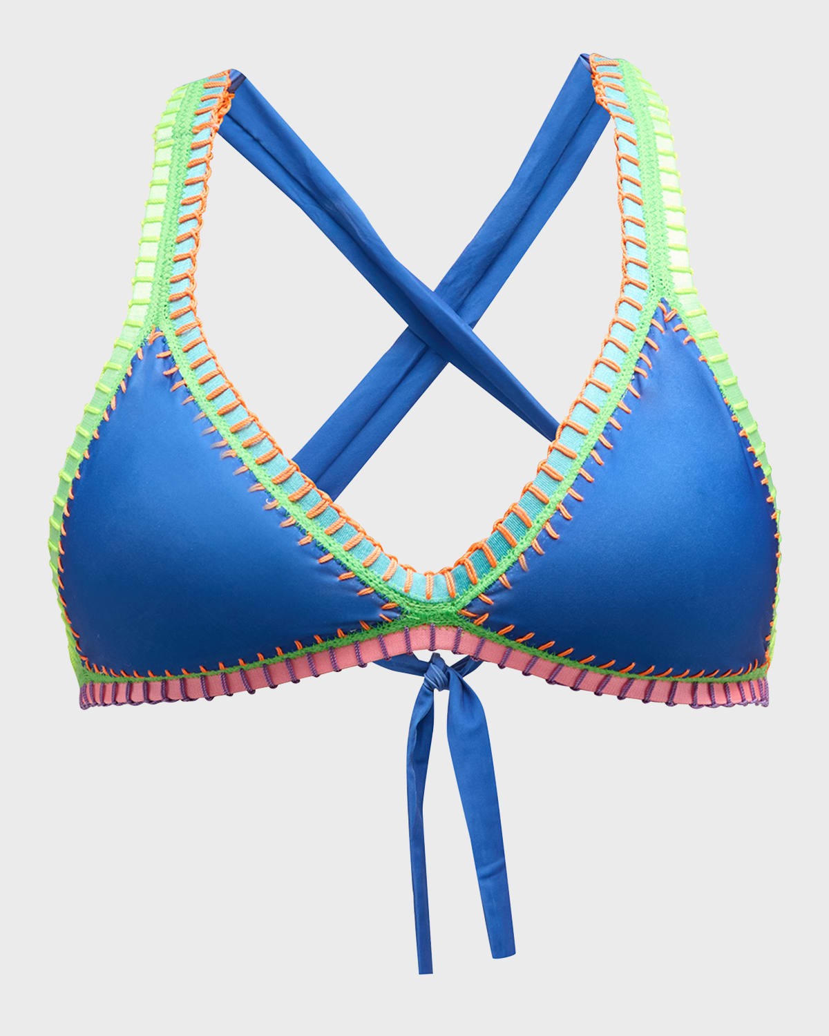 Platinum Inspired by Solange Ferrarini bikini top with contrasting crochet trim V neckline Fixed triangle cups Crisscross back straps Midback selfties Polyester/elastane Lining: Polyester/elastane Imported Bottoms sold separately