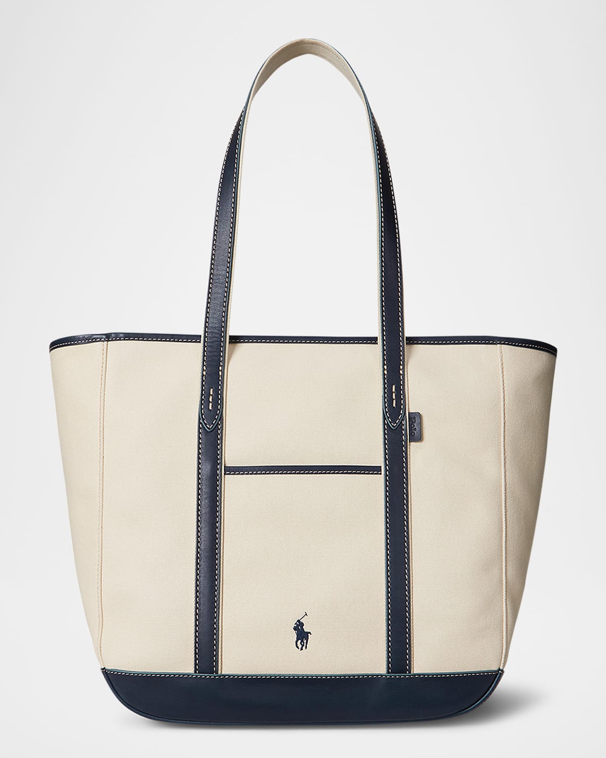 Polo Ralph Lauren tote bag in canvas with smooth leather trim Flat top handles Top zip closure Interior, one slip pocket Exterior, one slip pocket Approx. 14"H x 19.5"W x 5.5"D Imported