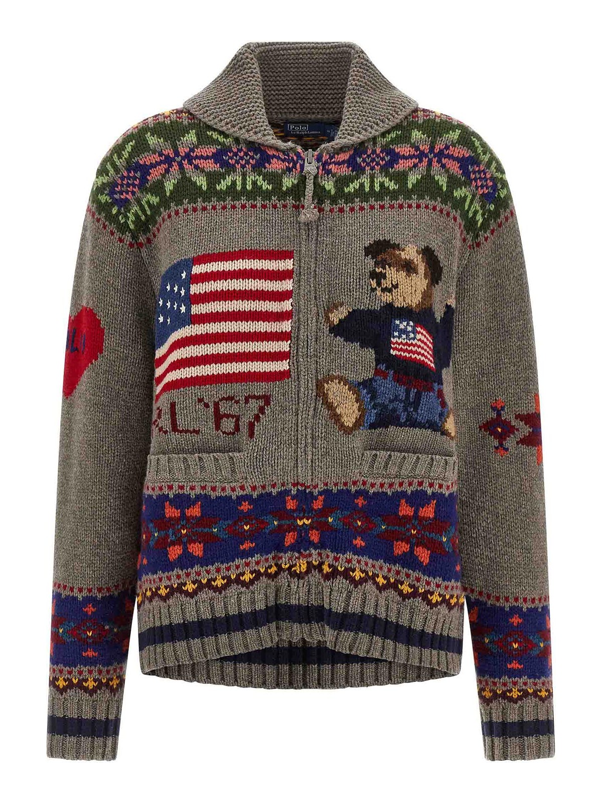 Cardigan « polo bear » à col châle en intarsia intégral, poches zippées, manches longues à revers et épaules tombantes