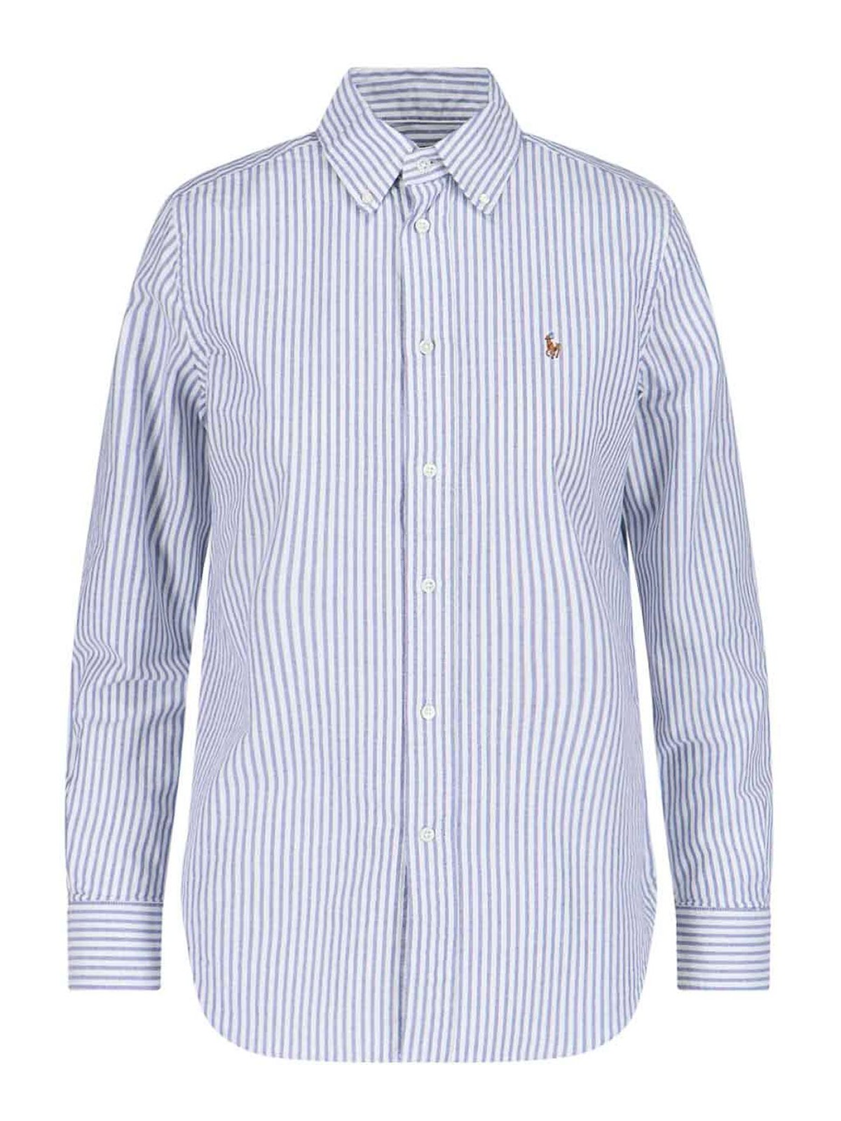 Chemise à logo Polo Ralph Lauren stretch à motif rayé bleu clair et blanc, col classique, boutons, poignets, logo multicolore, devant, ourlet incurvé