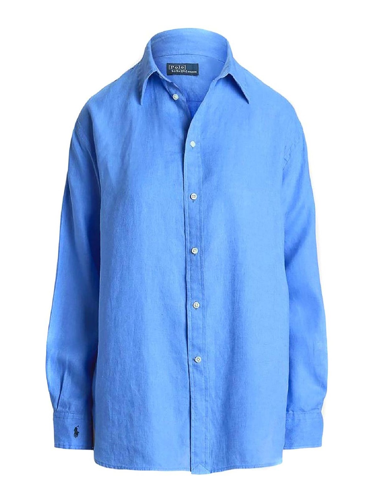 Chemise longue en lin signée Polo Ralph Lauren. Col classique, patte de boutonnage sur le devant et petit logo sur la poitrine