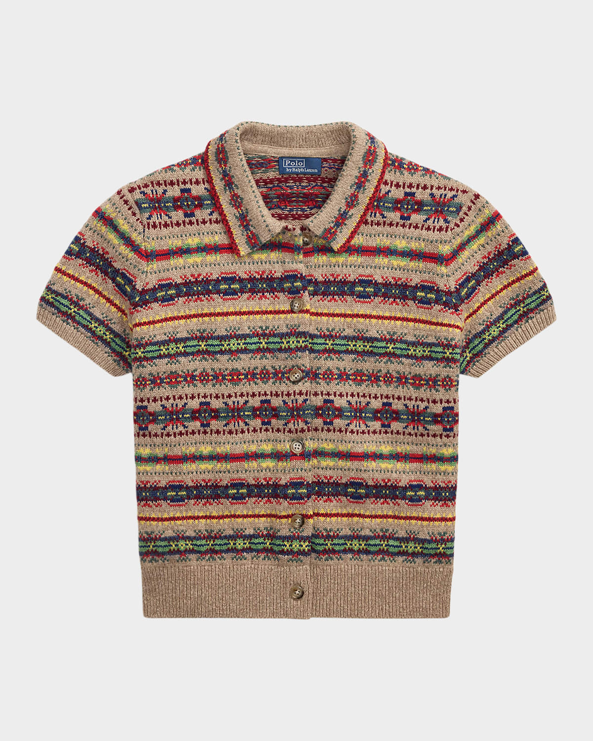 Crafted in a fine wool and cotton blend, this Polo Ralph Lauren cardigan features a Fair Isleinspired jacquard knit, designed in a slightly relaxed silhouette for a comfortable fit Approx. 21"L from shoulders to hem Spread collar; button front Short sleeves Hip length Relaxed fit Wool/cotton Imported