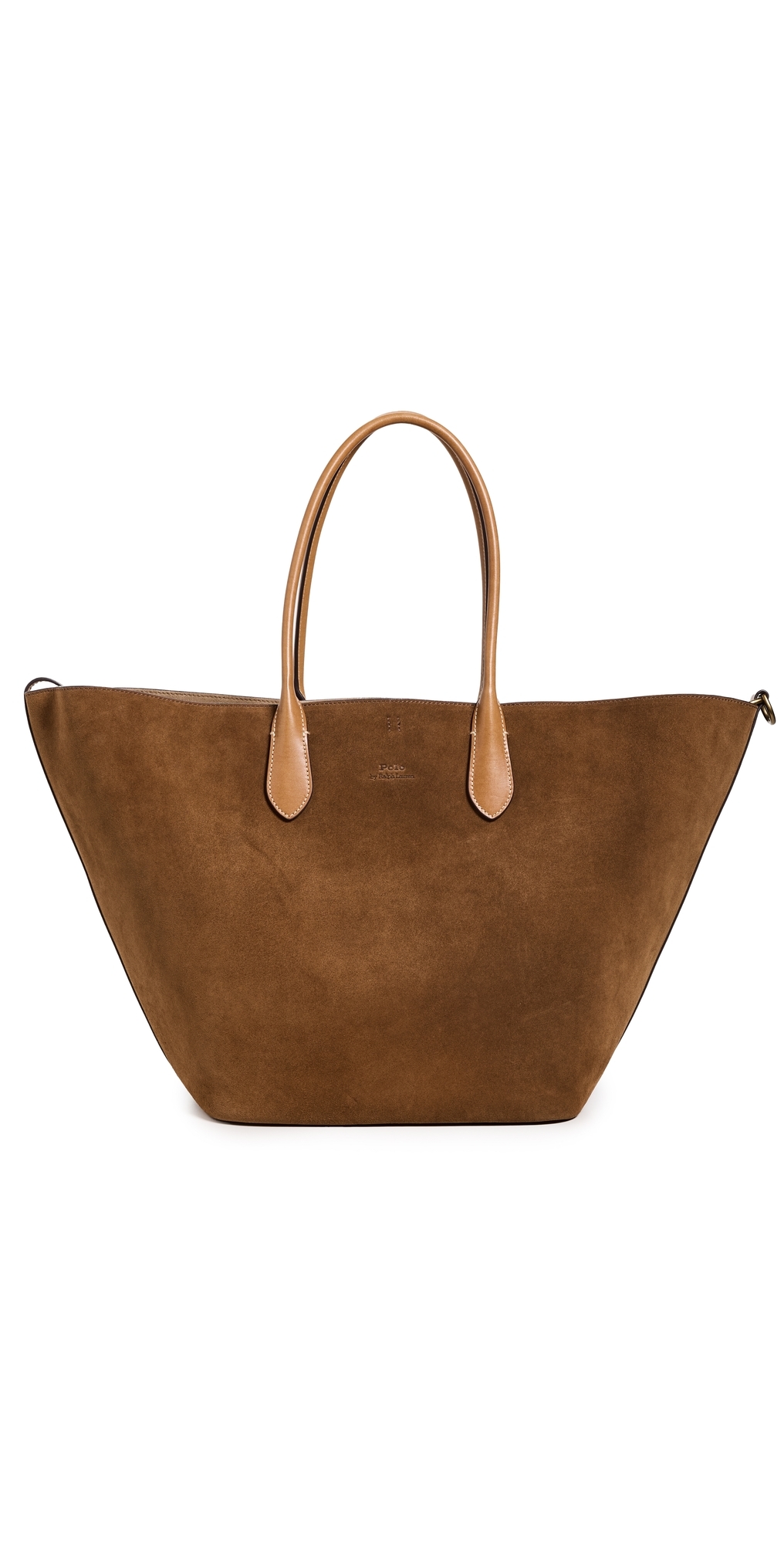 Cowhide suede. Strap at the top right secures with a D-ring at the top left to create a trapezoid-shaped silhouette. Embossed logo lettering at front. Open top. Multiple interior pockets. Lining: Suede. Weight: 28oz / 0.79kg. Imported, China. Measurements: Height: 13.75in / 35cm Length: 25.5in / 65cm Depth: 7.75in / 19.75cm Handle drop: 8.75in / 22cm
