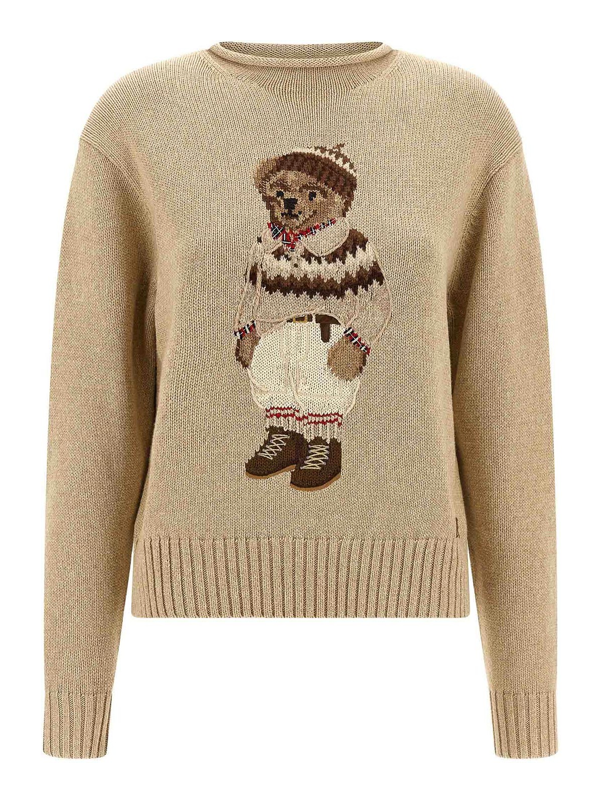 Pull en laine chinée avec motif « polo bear » en intarsia, col rond roulé, manches longues à revers et épaules tombantes