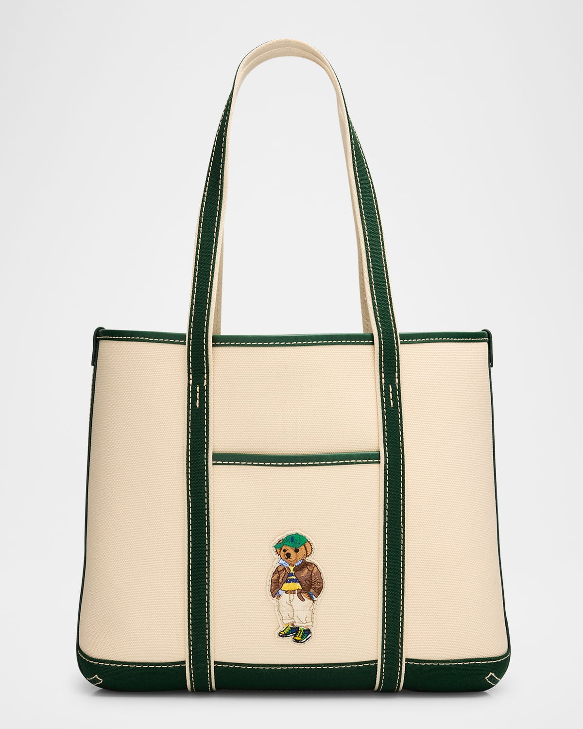 This Polo Ralph Lauren shopper tote bag is crafted in durable cotton canvas with fullgrain burnished leather trim. An embroidered felt patch featuring the iconic Polo Bear adorns the front for an additional playful touch. Flat shoulder straps Open top Exterior, one slip pocket Interior, one zip pocket Approx. 10.8"H x 12.8"W x 2.3"D Imported