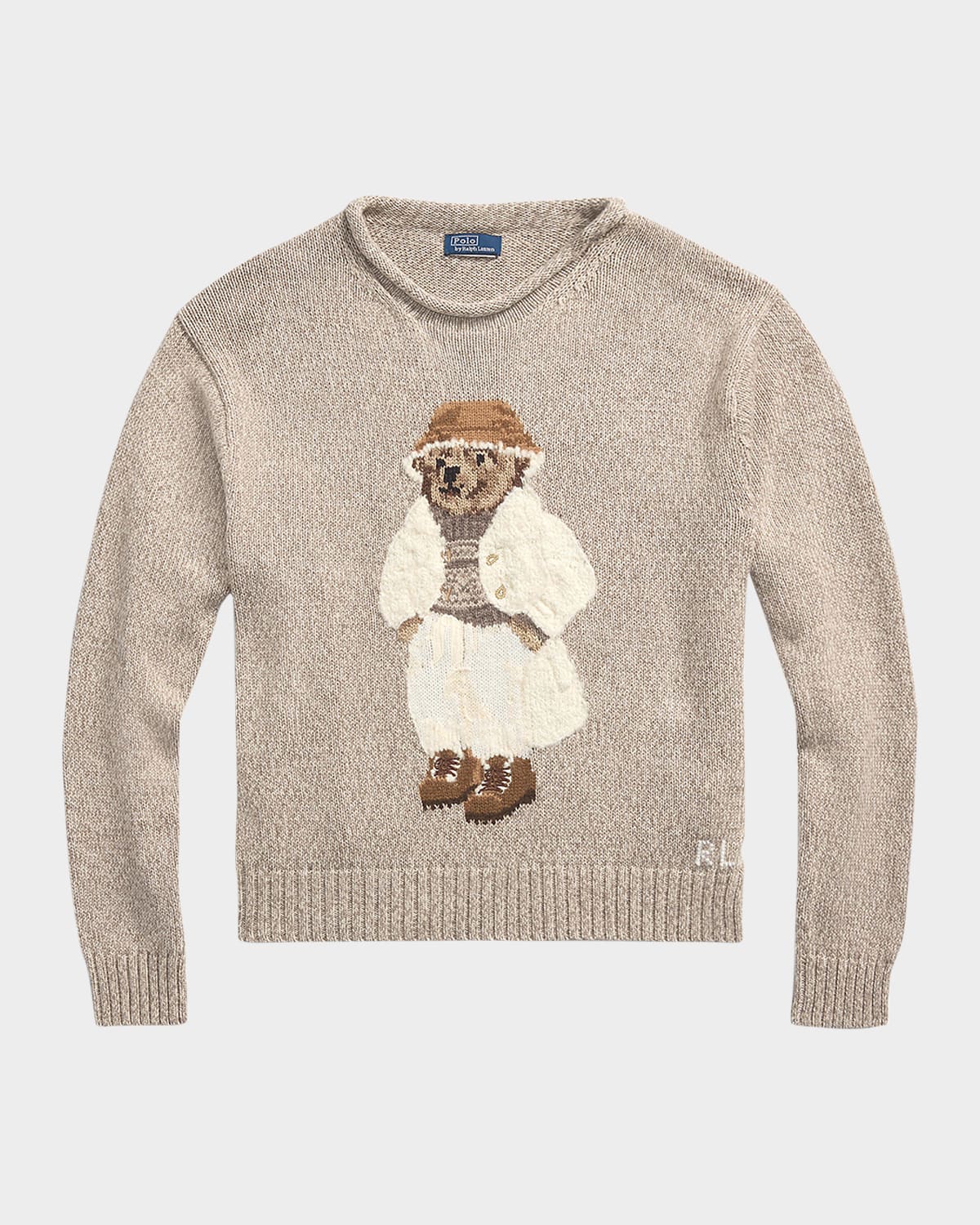 Polo Ralph Lauren sweater with intarsiaknit signature Polo bear and chainstitched monogram logo Rolled crew neckline Long sleeves Relaxed fit Pullover style Cotton/wool/elastane Hand wash or dry clean Imported