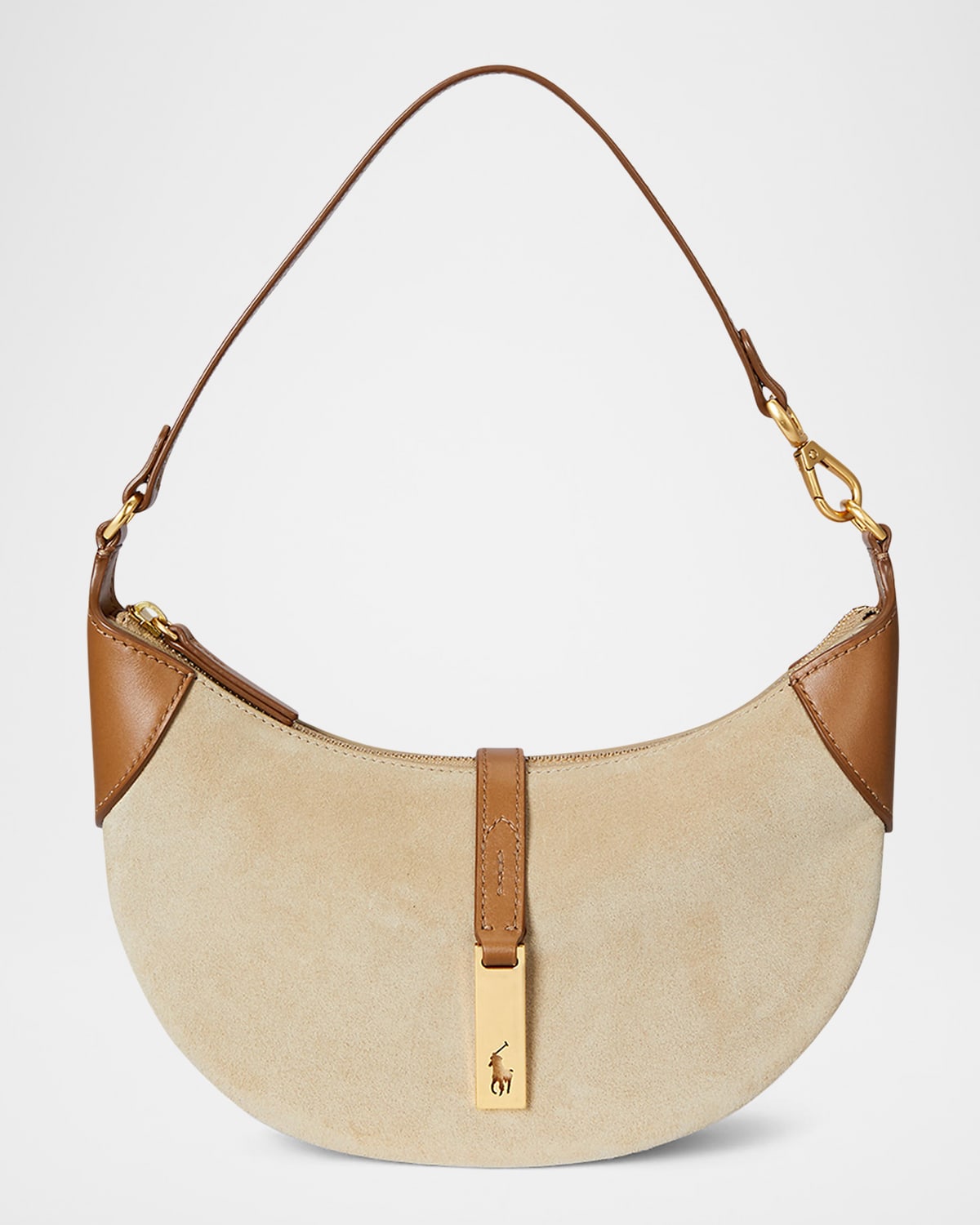 Polo Ralph Lauren shoulder bag in suede with leather trim Shoulder strap with detachable end, 8.5" drop Can be worn as a shoulder or wristlet bag Zip top closure with weighted Polo ID brass plaque strap Interior, one card slot Lining: Leather Approx. 8"H x 10"W x 1.5"D Imported