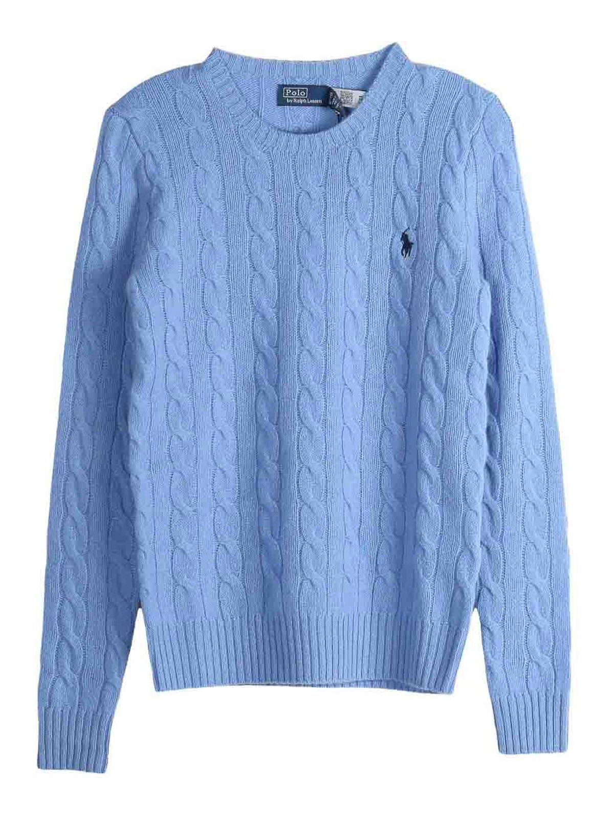 Col en V en maille torsadée bleu clair, manches longues, petit logo brodé