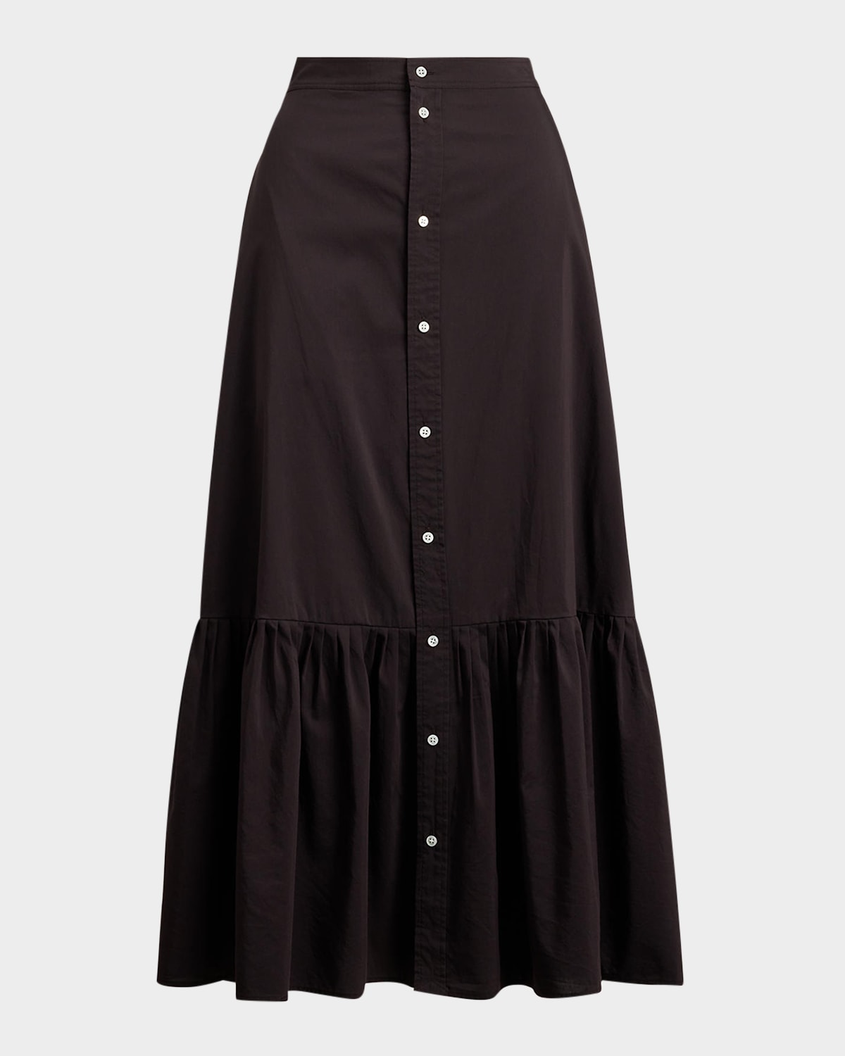 Crafted in cotton and silk yarns, this Polo Ralph Lauren midi skirt is distinguished by the contrast buttons and knifepleated ruffle hem Approx. 35.5"L from waistband to hem Sits high on the hips Onseam pockets Hem falls below the knee Aline silhouette Cotton/mulberry silk Made in Portugal