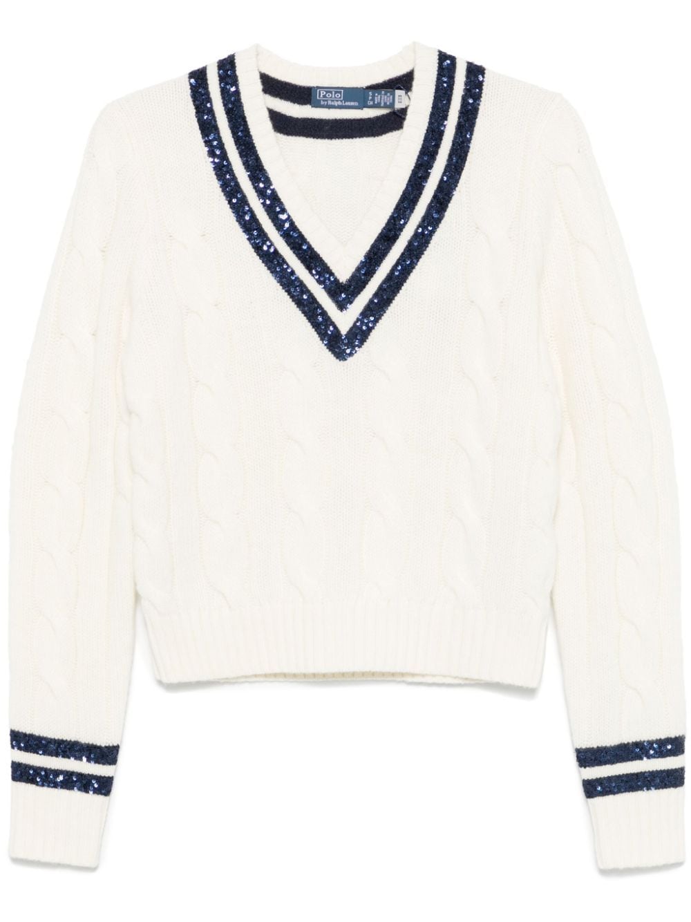 cream white cashmere cable knit sequin embellishment ribbed V-neck stripe detailing long sleeves ribbed cuffs and hem