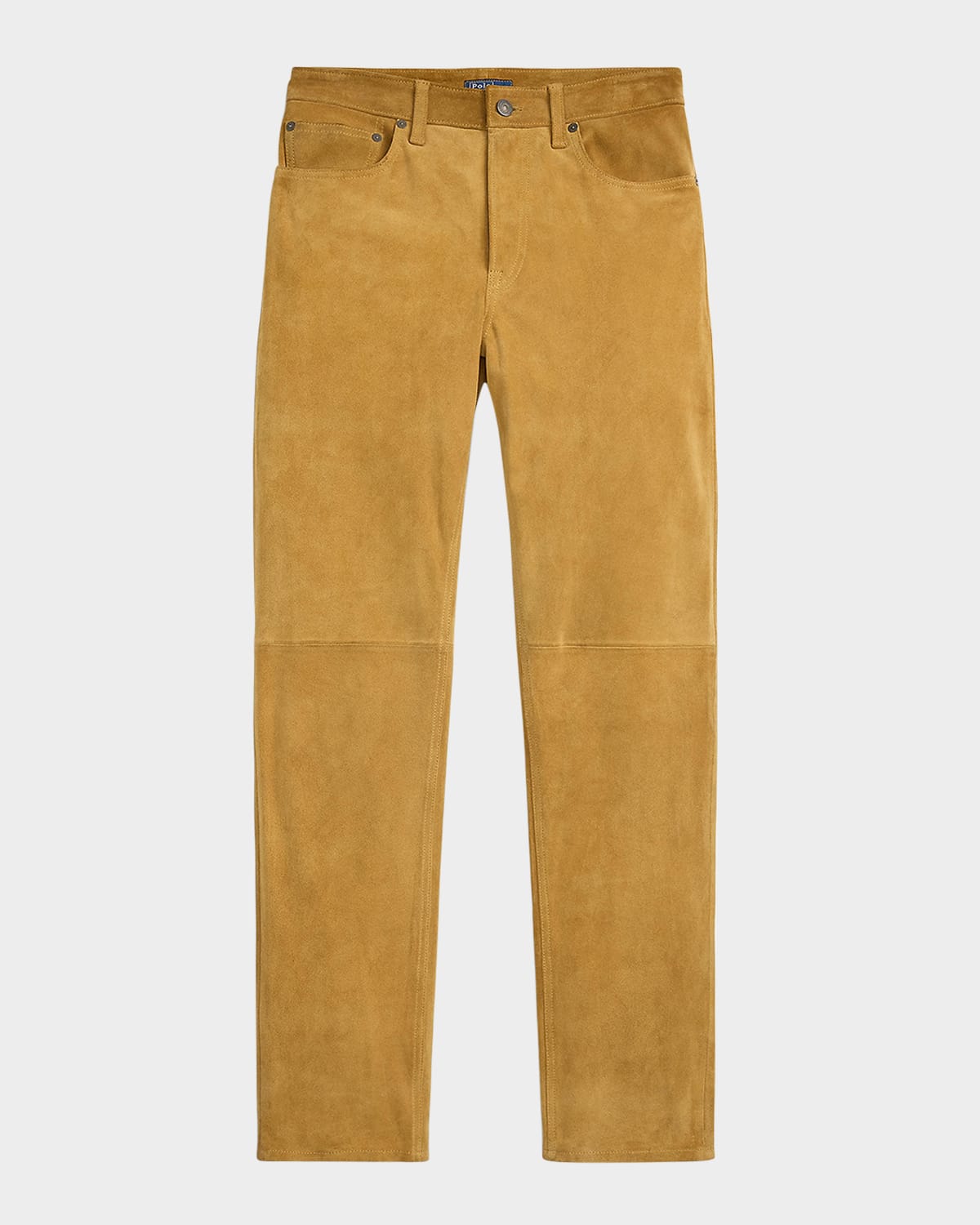 These Polo Ralph Lauren pants are crafted in sueded leather with a velvetysmooth feel, complete with classic details and signature metal rivets Highrise sits high on the hips Flat front Fivepocket style Full length Relaxed, slim legs Button/zip fly; belt loops Leather Dry clean Imported