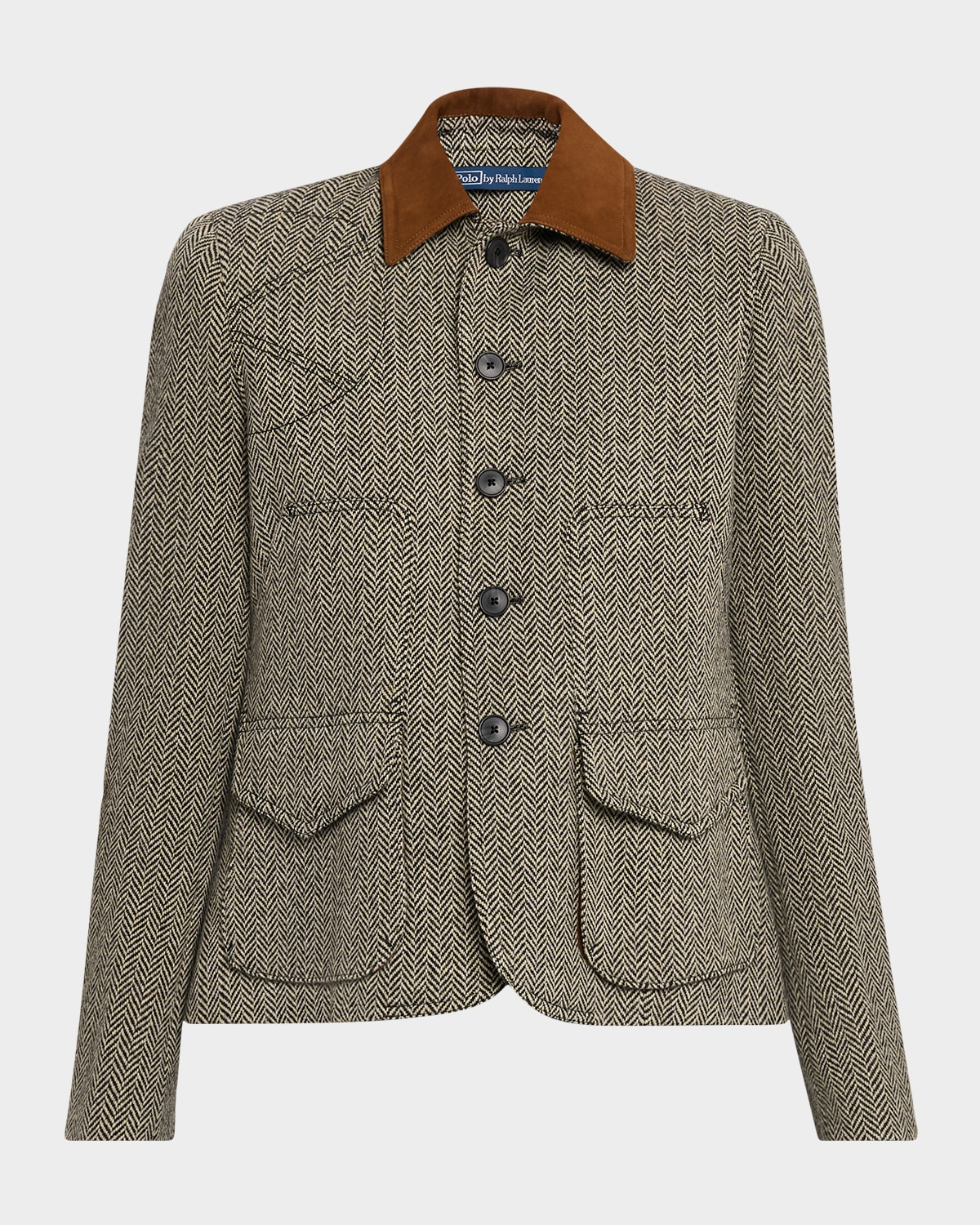 Rendered in Italian woolblend herringbone, this Polo Ralph Lauren jacket is tailored for a slim silhouette and features lambskin suede details on the collar Approx. 23"L from shoulders to hem Spread collar; button front Long sleeves; approx. 33"L Button cuffs Angled side pockets Side flap pockets Slim fit Wool/nylon/polyamide/leather Made in Portugal