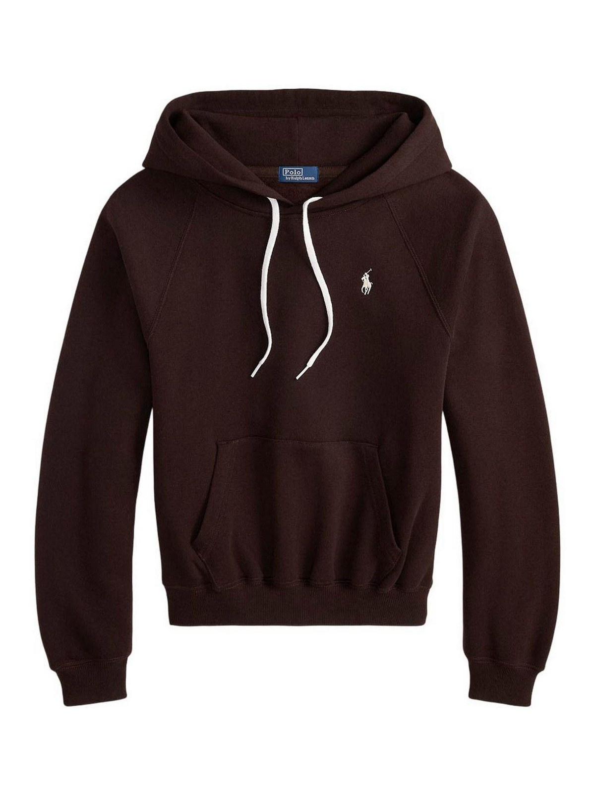 Capuche marron foncé avec cordon de serrage, poche kangourou, manches longues, motif de poney emblématique