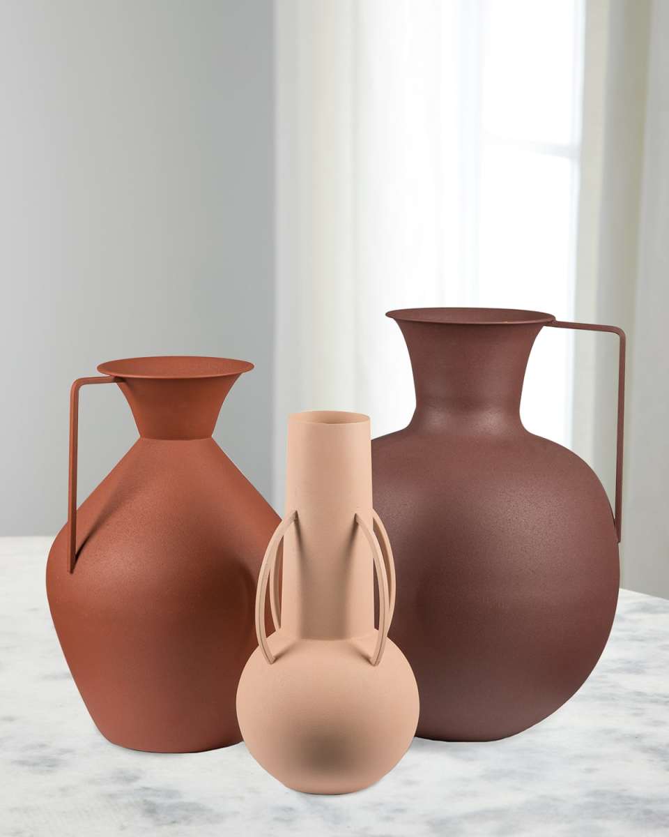 The Roman Vases are as authentic and as beautiful as you'd expect to find in ancient Roman times. Powdercoated in soothing contemporary hues and finished with a unique texture - the perfect balance of oldworld charm and contemporary comfort. Handcrafted of iron Small, 12"Dia. x 13"Dia. Medium, 7"Dia. x 14"Dia. Large, 10"Dia. x 15"Dia. Item Weight (Lbs.): 12.0 Wipe clean Set of three Imported