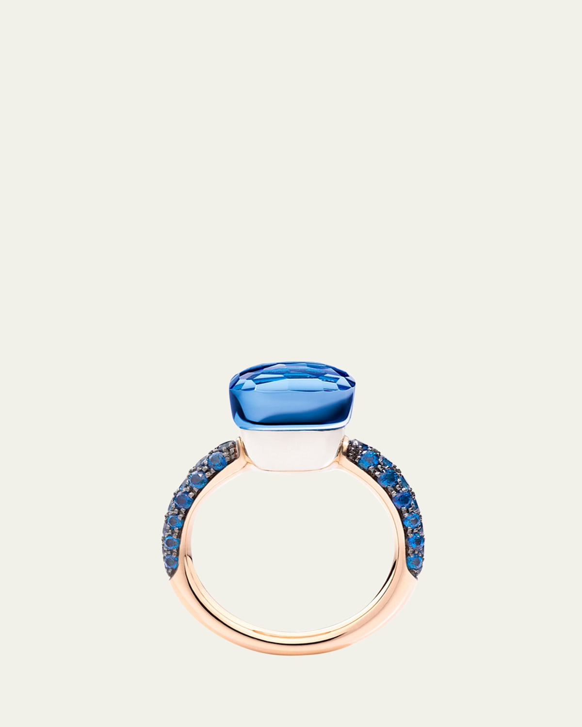This cocktail ring from the Pomellato Nudo collection stars a doublet stone at the center. This doublet is layered with London blue topaz and lapis lazuli. The shoulders of this ring are accented with 38 thermal diffused topazes for additional glamour. Polished 18karat rose gold and white gold Doublet carat weight: 10.2 Diffused topaz carat weight: 0.8 Made in Italy