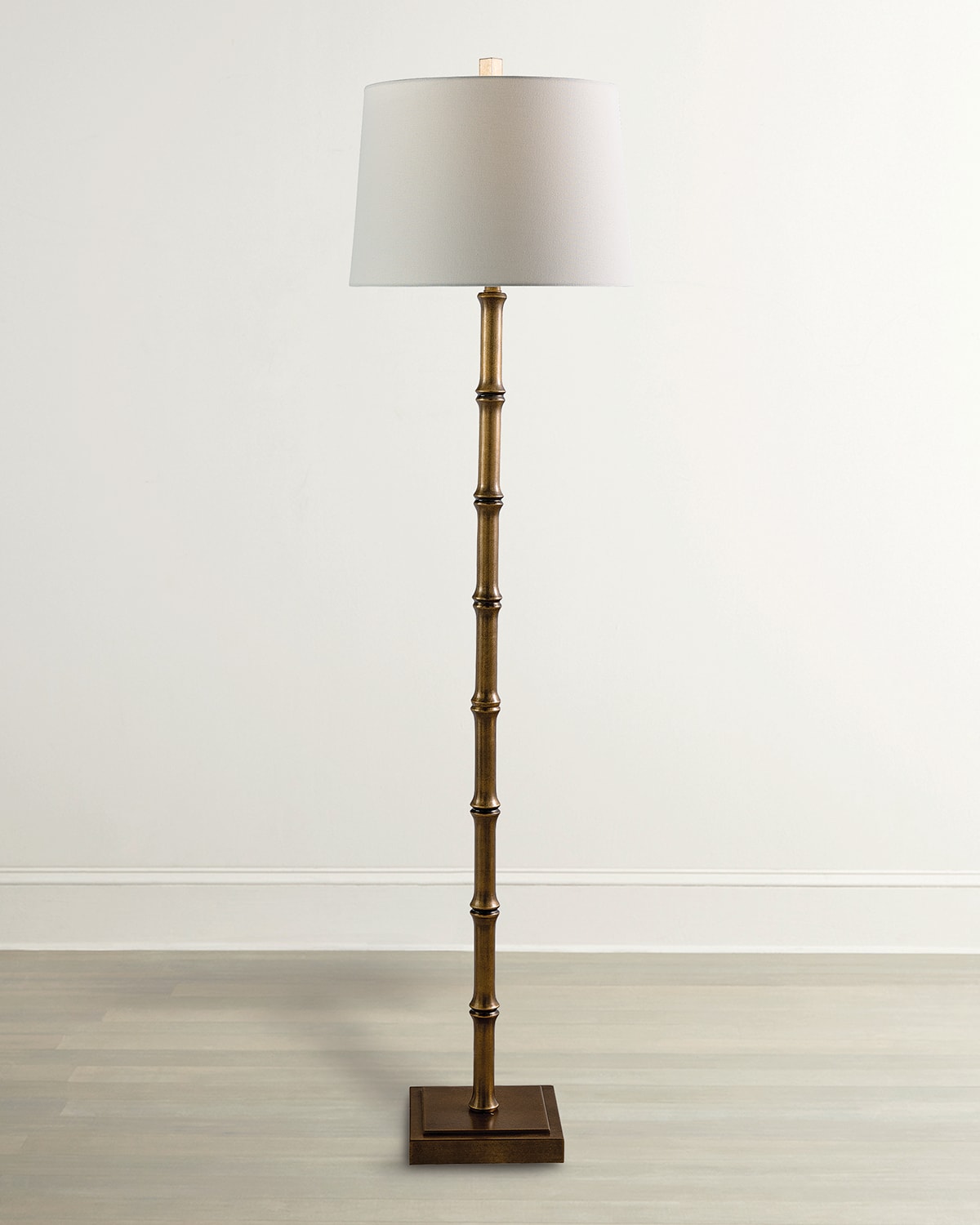 Floor lamp is handcrafted of steel and metal in an antiqued brass finish with bamboo turnings Approx. 17"Dia x 63"T Lampshade Dimensions (inches): 15x17x12 Number of Lights: 1 Light Max wattge: 150 watts Assembly not required Includes hardware Three way switch Cord length: 8 ft. UL listed Wipe clean Weight, 16.0lbs Boxed weight, approximately 22.0lbs Imported