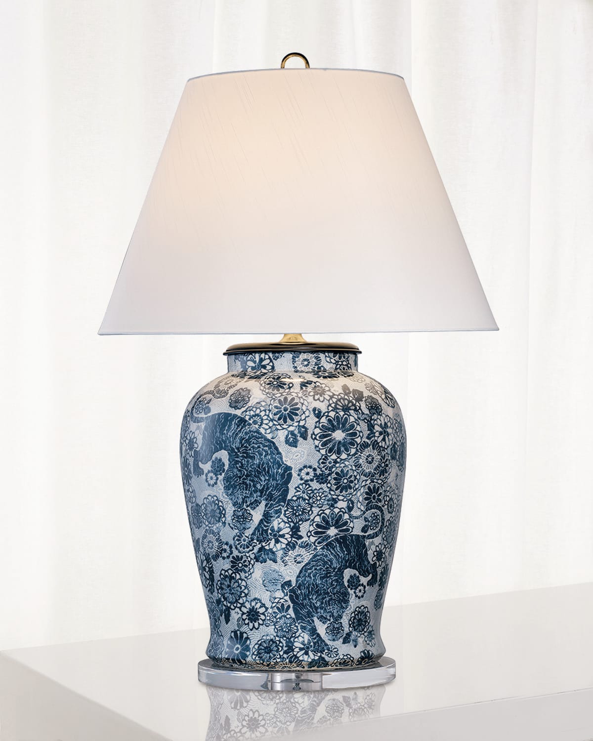 Porcelain table lamp with solid brass hardware. Acrylic base with matching finial. Shade dimensions: 23"Dia. (12" at top) x 15"T. Tapered hardback shade with soft rolled edge; off white polyester fabric. Brass spider. Overall: 23"Dia. x 36"T. Cord length: 6 ft. Uses one use 220V, typeA 150watt bulb. Threeway switch. UL listed. Imported. Boxed weight, approximately 40 lbs.