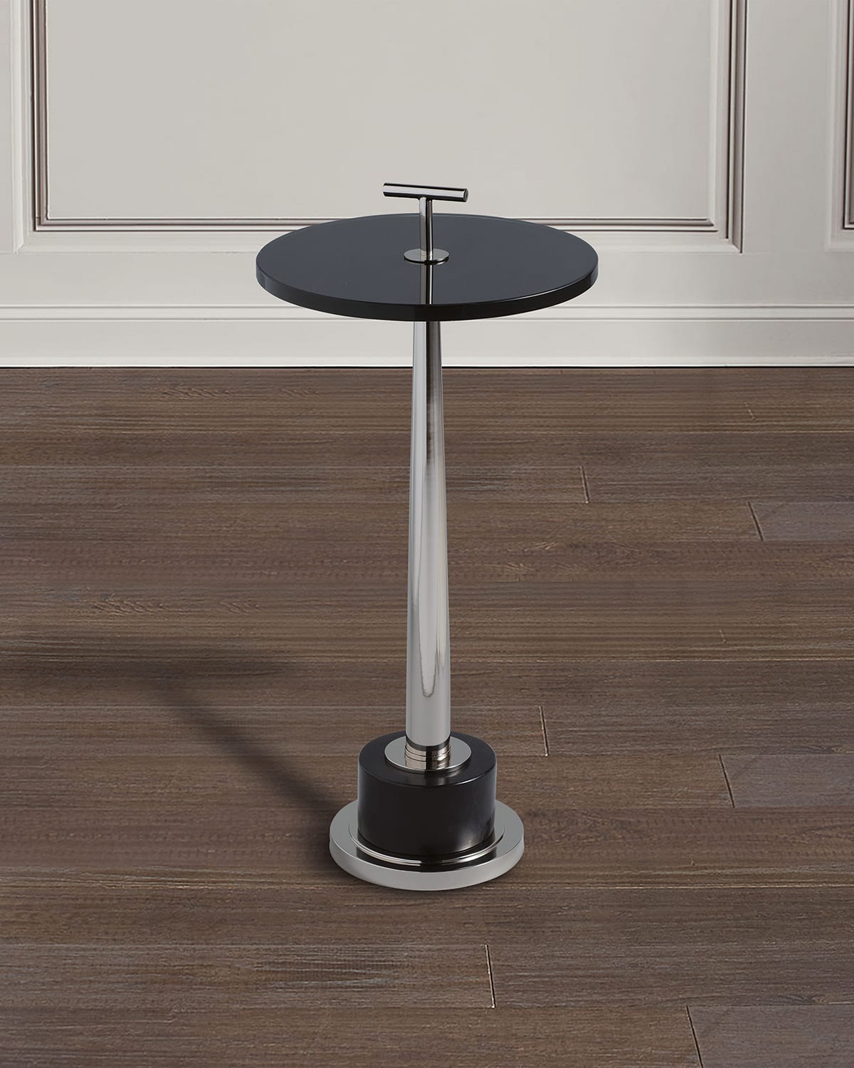 Handcrafted table is accented with a black tempered glass top and granite base Overall, approx. 12"Dia x 25.5"T Finished back Imported Boxed weight, approximately 20.0lbs
