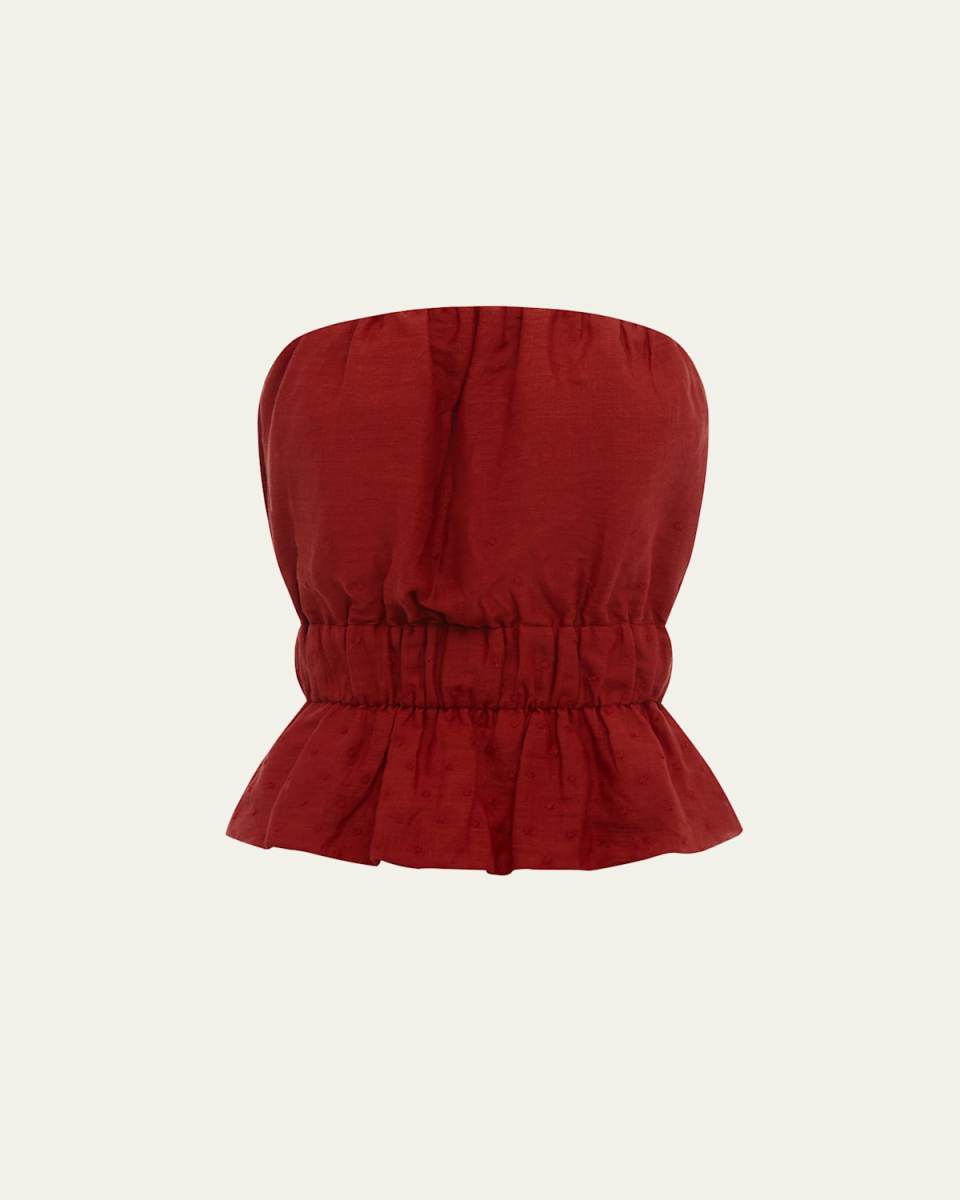 Posse "Aurelia" top features polkadot embroidery and a billowy hem Strapless neckline with grip tape Sleeveless Relaxed fit Invisible back zip closure Ramie Unlined Hand wash or dry clean Imported