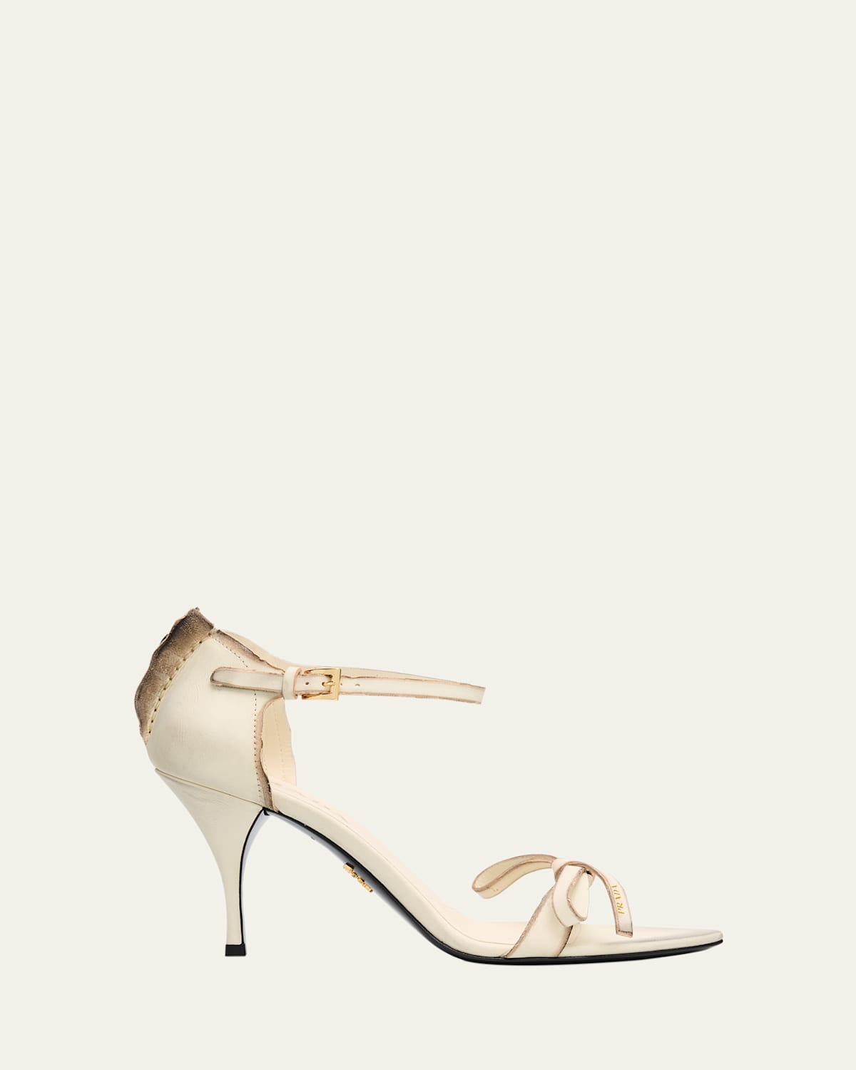 Complete with an antiqued effect, visible stitching, and rawcut edges, these sandals by Prada are crafted from calfskin leather for an intentionally unfinished design 3.25 in / 85 mm covered stiletto heel Pointed open toe Adjustable ankle buckle strap Leather lining Rubber outsole Professional cleaning recommended Made in Italy