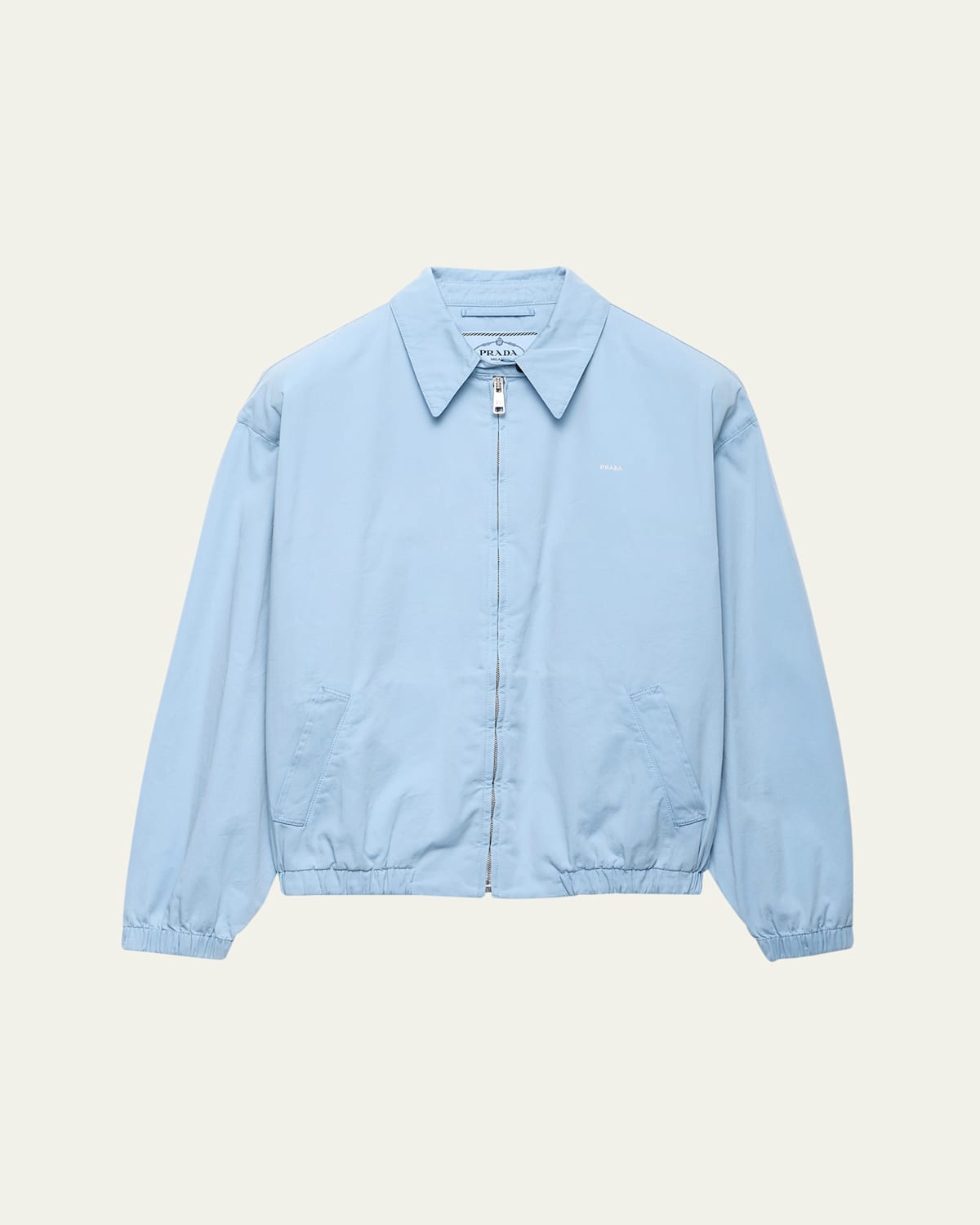 Soft shapes and elevated workmanship define this Prada gabardine jacket, enriched with a washed finish for a vintage effect Approx. 25.20"L from shoulder to hem Point collar Long sleeves Front welt pockets Embroidered logo lettering Elasticized cuffs and hem Blouson fit Zip front closure Cotton Made in Italy