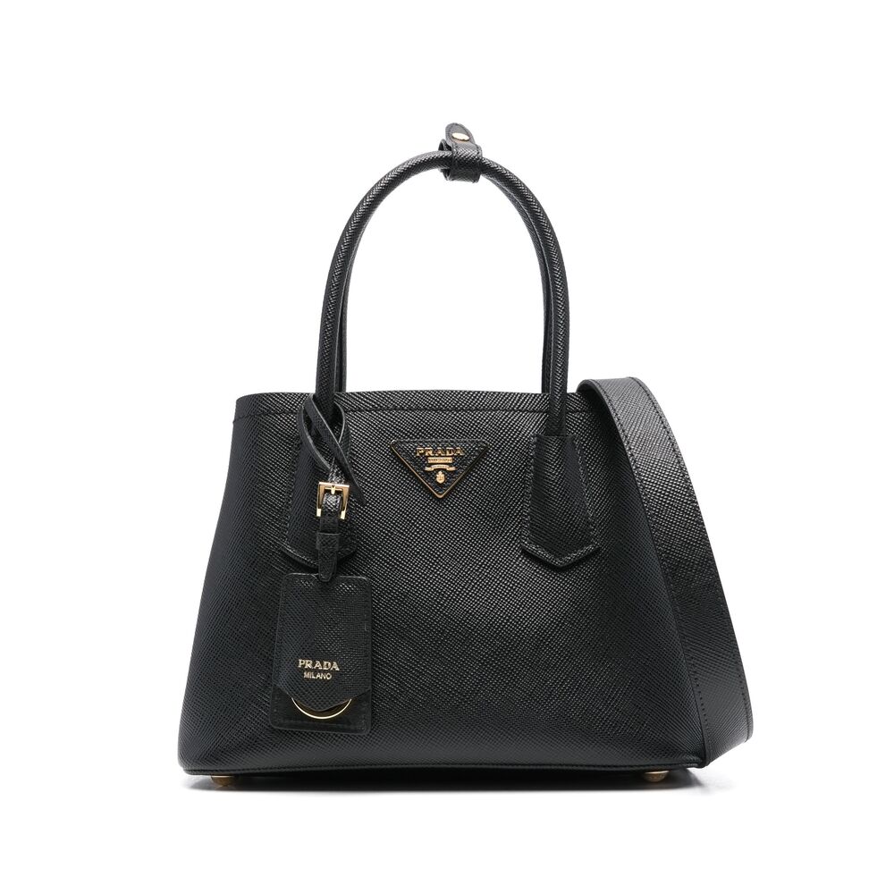 black leather gold-tone hardware logo patch to the front adjustable detachable shoulder strap two top handles luggage tag partitioned compartment internal slip pocket