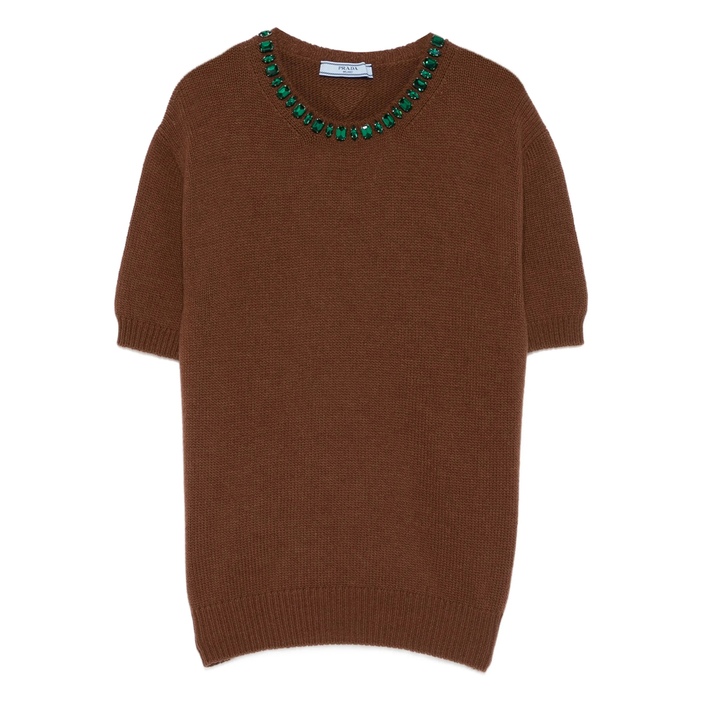brown ribbed knit jewel embellishment triangle logo short sleeves semi-raglan shoulder