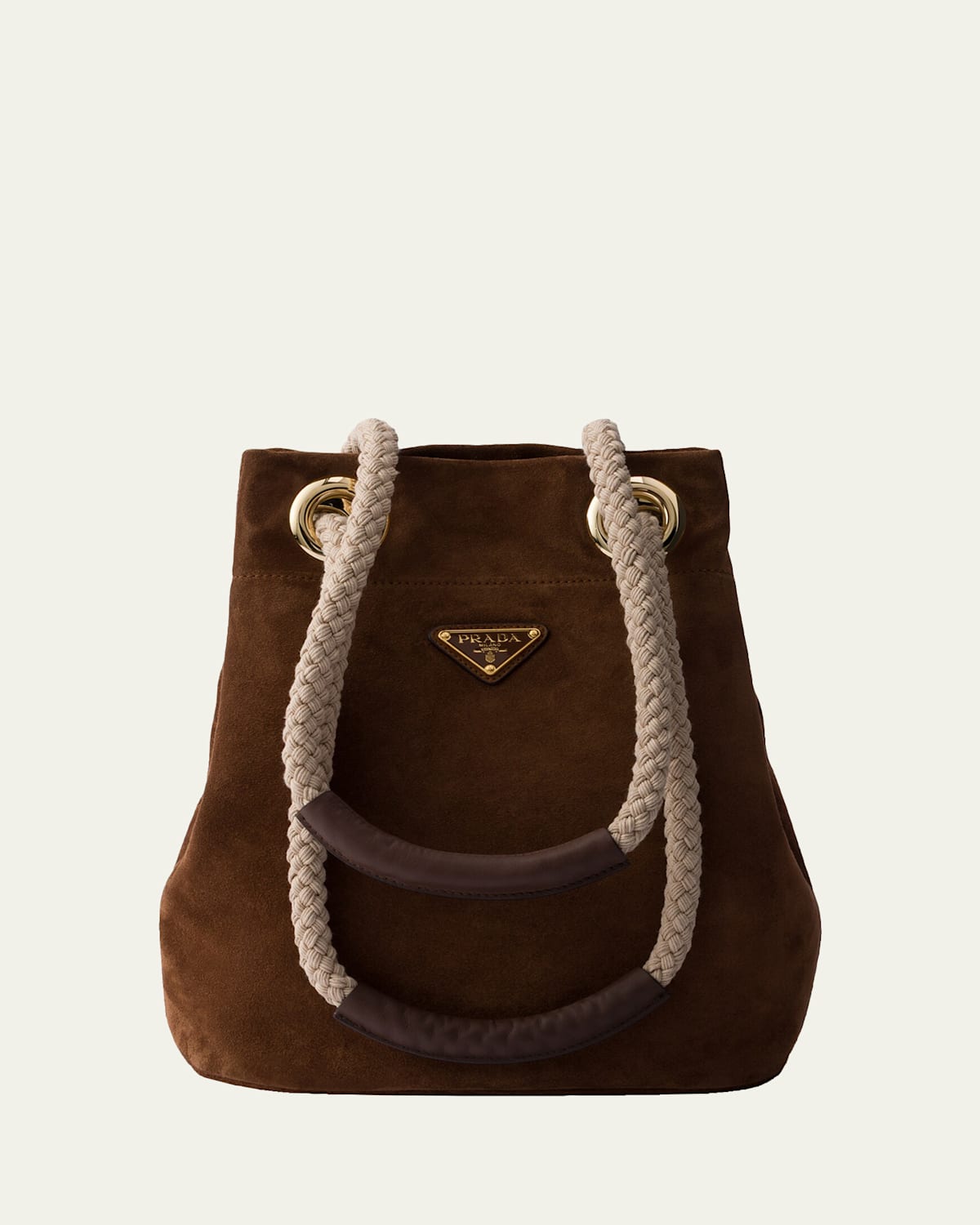 The Prada "Mariner" bucket shoulder bag in suede is finished here with soft lines and nauticalinspired cord handles Sliding cord/leather handle, 19.7" max drop Open top with drawstring closure Signature enameled metal triangle logo Interior, one zip pocket Logoprint ReNylon lining Approx. 11"H x 9.3"W x 6.5"D Made in Italy