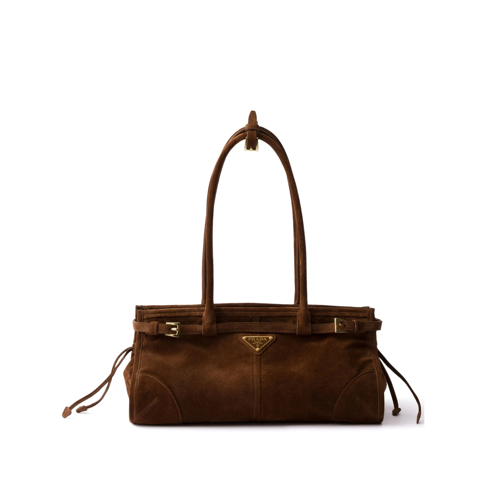 brown calf suede enamel triangle logo gold-tone hardware belt detailing drawstring side detail two long top handles adjustable detachable shoulder strap internal zip-fastening pocket internal logo patch logo-jacquard lining main compartment top zip fastening