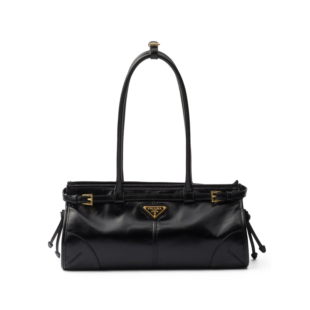 black calf leather smooth grain glossy finish enamel triangle logo seam detailing knot detailing gold-tone hardware concealed top zip fastening adjustable detachable shoulder strap two long top handles internal logo plaque full lining