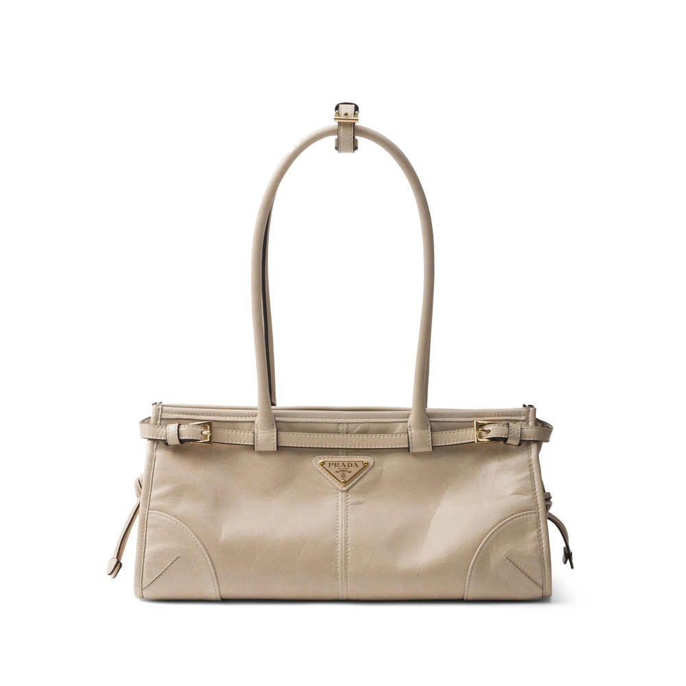 beige leather nappa leather smoothing finish enamel triangle logo adjustable detachable shoulder strap two long top handles top zip fastening main compartment