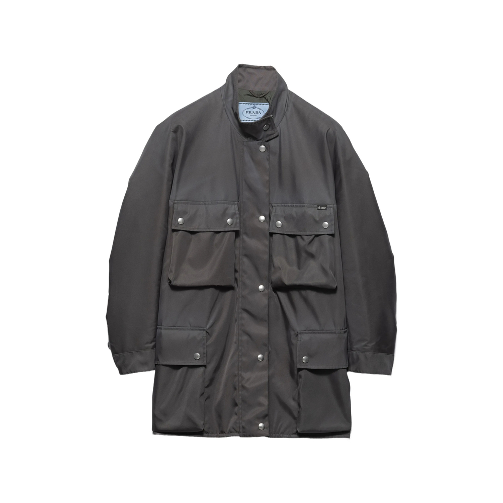 grey straight fit quilted lining stand-up collar flap pockets long sleeves treated garment