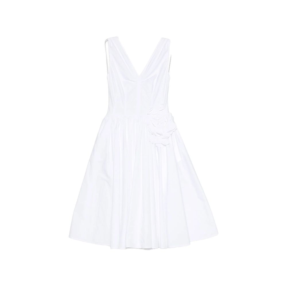 white flower appliqué V-neck sleeveless gathered skirt midi-length