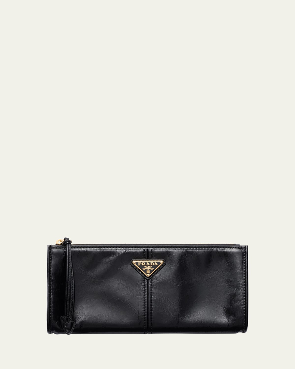 Prada pouch bag crafted in soft and luxurious crinkled leather Zip top closure Interior, two slip pockets Approx. 3.9"H x 7.9"W Made in Italy