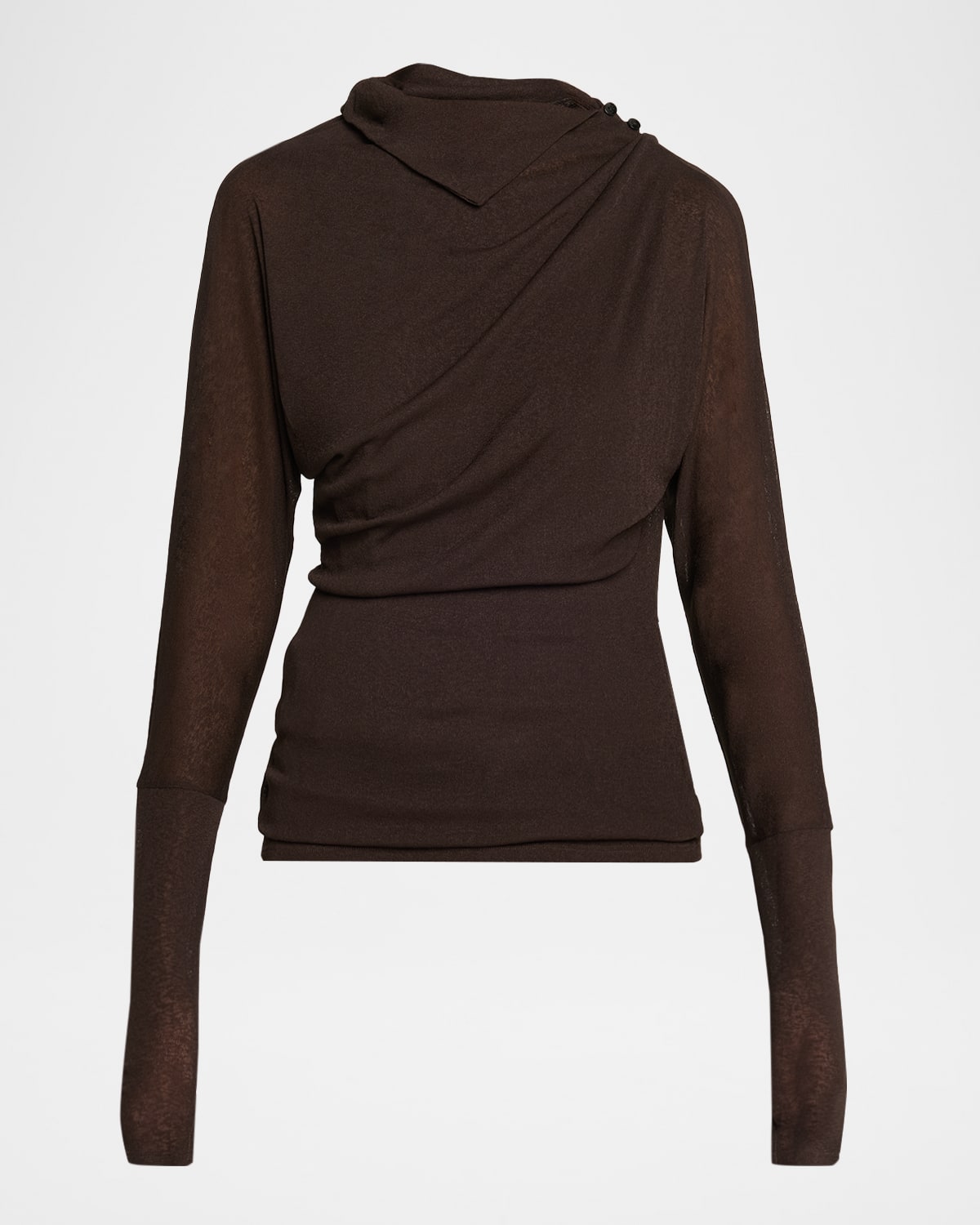 Proenza Schouler "Golda" top is draped in a soft jersey featuring a split Mock neck detail, dolman sleeves, and slit cuffs Mock neckline Long dolman sleeves Fitted Pullover style Polyester Dry clean Imported
