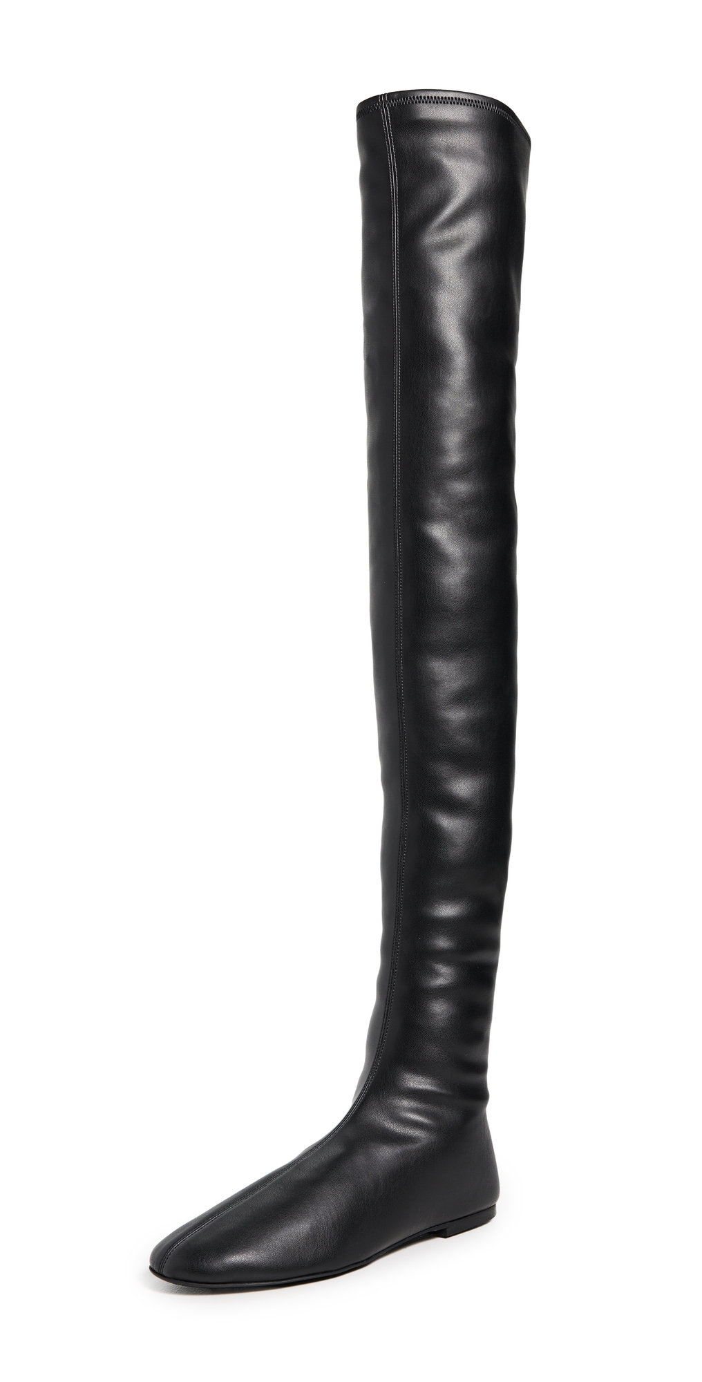 Upper: Faux leather. Center front seam detail. Lightly cushioned footbed. Non slip rubber binding at top. Lining: Unlined. No closure, pull-on design. Round toe. Leather sole with rubber heel cap. Made in Italy. This item cannot be gift-boxed. Measurements: 28.25in / 72cm Circumference: 15.75in / 40cm