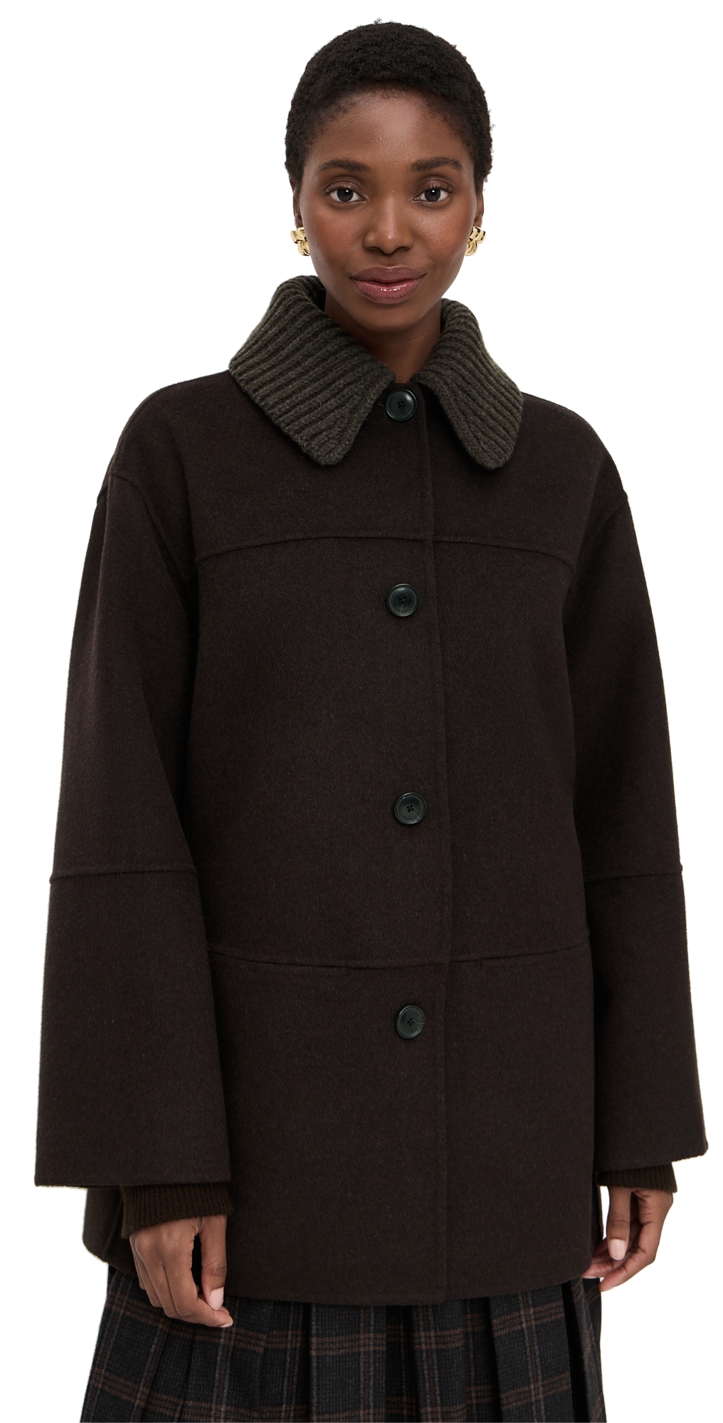Fabric: Mid-weight, non-stretch felt. Optional knit collar. Collared neck. Long sleeves. Button placket. Patch front pockets. Shell: 55% wool/35% polyester/10% cashmere. Trim: 100% wool. Unlined. Dry clean. Imported, China. Measurements: Measurements from size 2 Length: 30.75in / 78.0cm, from shoulder