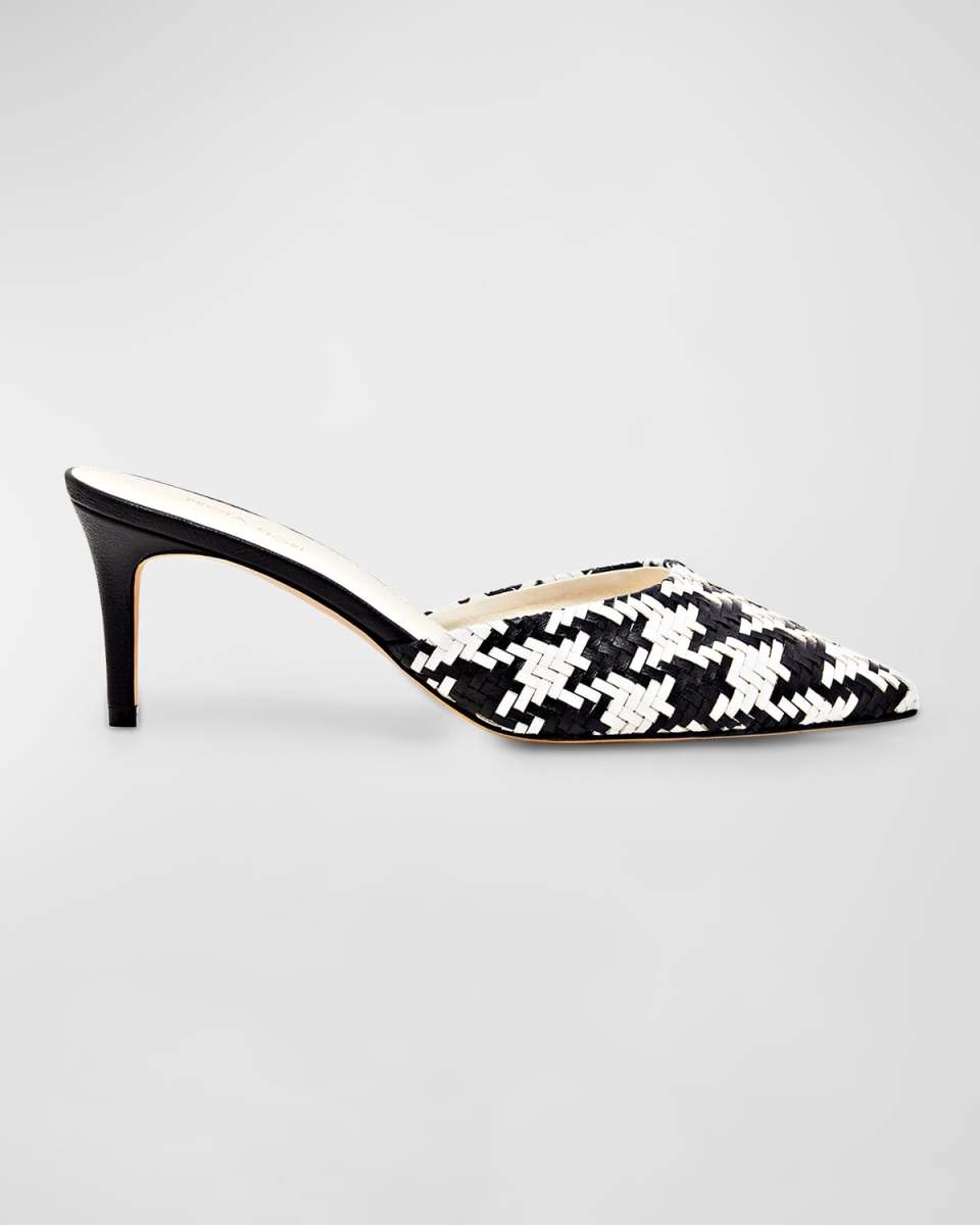 Prota Fiori "Ivy" ecofriendly, hand woven twotone houndstooth apple skin mules 3.00 in / 75 mm stiletto heel Pointed toe Vegetable tanned leather outsole; recycled cardboard midsole Apple skin is durable and water resistant Slide style Typically runs true to size Handmade in Italy