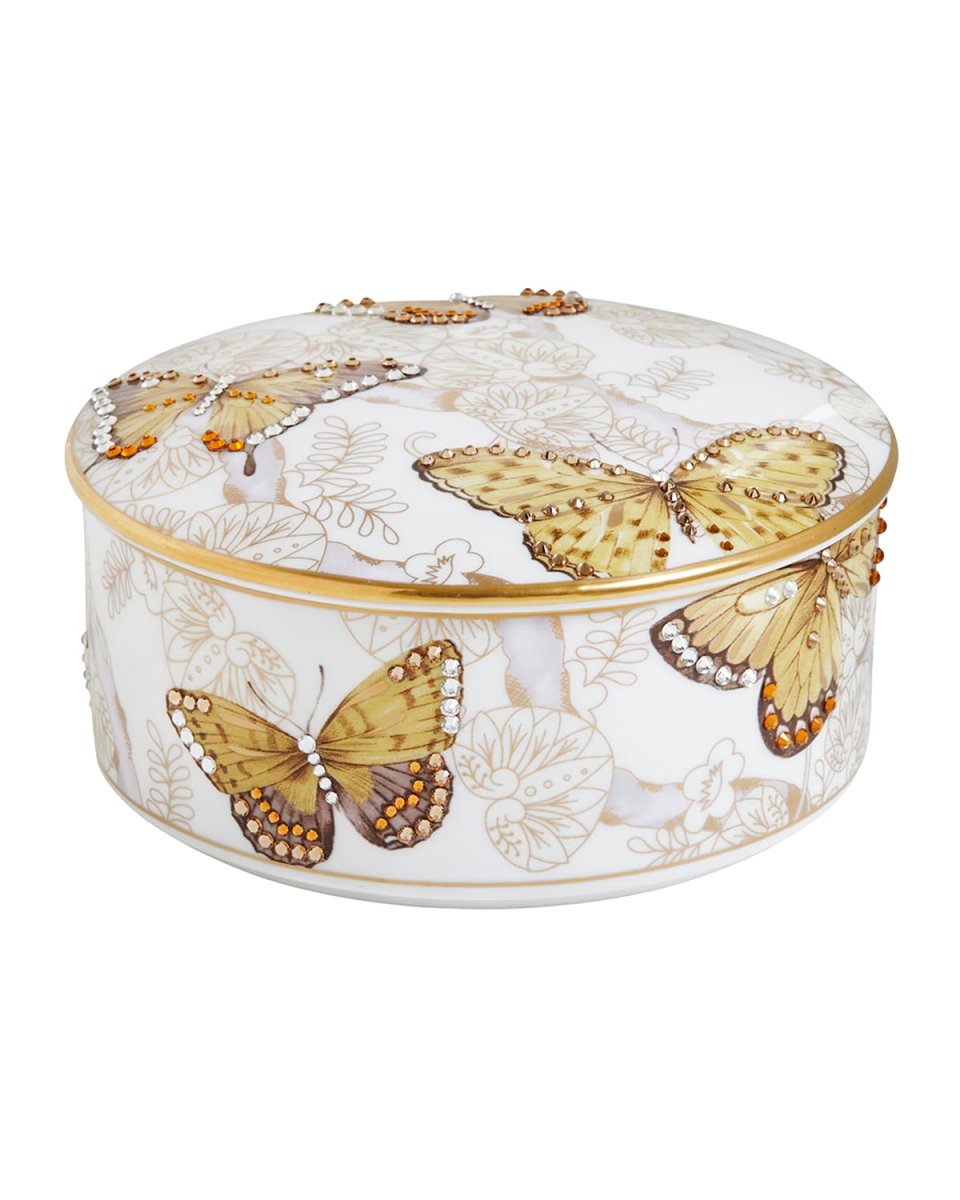 Jewelry box made of fine bone china. Bejeweled with Swarovski® crystals. 24karat gold plated. Hand painted. Approx. 4.5"Dia. x 2"T. Imported.