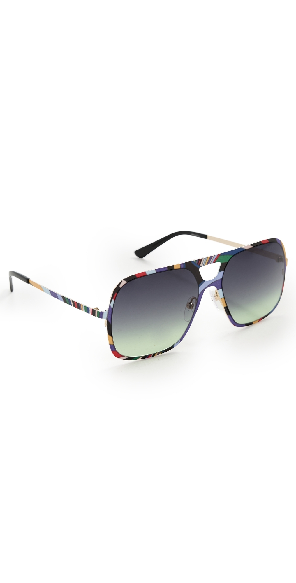 Multicolor frames. Drawstring pouch included. Aviator frame. Non-polarized lenses. Imported, China. Metal frame. Plastic lenses. Measurements: Width: 5.5in / 14cm Height: 2in / 5cm Lens Width: 56mm Bridge: 17mm Arms: 140mm