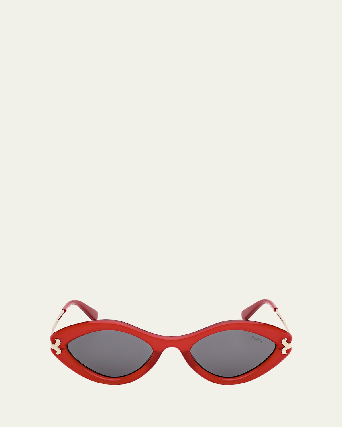 Emilio Pucci "EP0223W" oval sunglasses in acetate and metal Lens/bridge/temple (in mm): 5421140 Solid lenses; logo on the corner Saddle nose bridge Logo on temples Thin, tapered arms Capped earpieces 100% UVA/UVB protection Imported