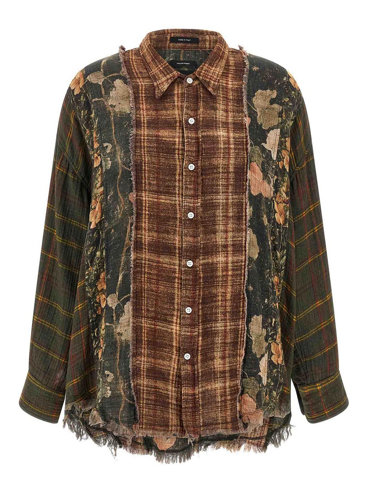Chemise en patchwork à manches longues boutonnées avec poignets et épaules tombantes, ourlet asymétrique à franges