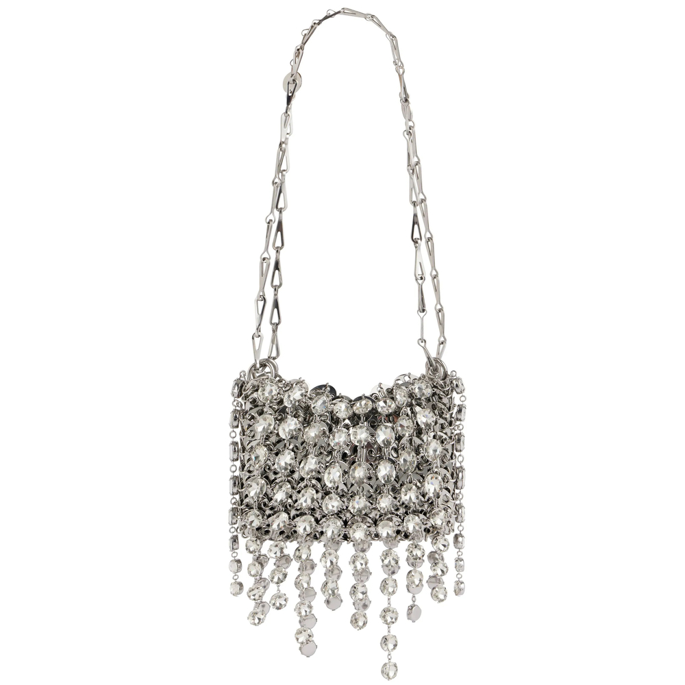 silver-tone concealed magnetic fastening sliding chain-link shoulder strap crystal embellishment main compartment This piece comes complete with a protective dust bag.