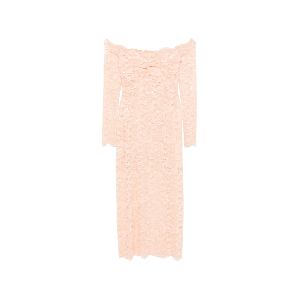 light pink floral lace scalloped trim long sleeves off-shoulder