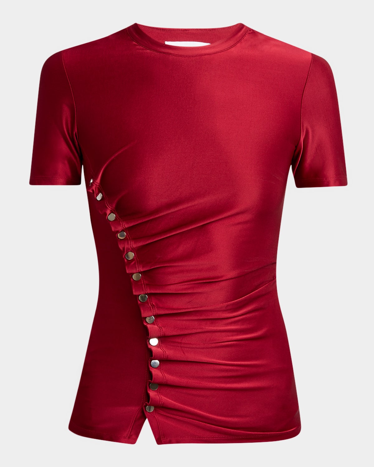Rabanne top featuring front snap gathering Crew neckline Short sleeves Fitted Pullover style Viscose/elastane Made in Portugal