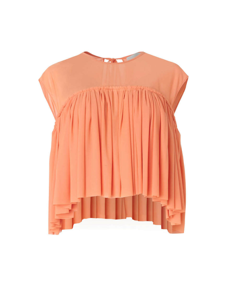 FINAL SALE The Jula Top in Peach by Rachel Comey is a flowy, sleeveless top featuring a draped and pleated bodice crafted in a tissue jersey. Pair back to the matching Kiara Skirt for a coordinated set. 100% Polyester Tie closure at neck Made in USA #242W-329-J1795