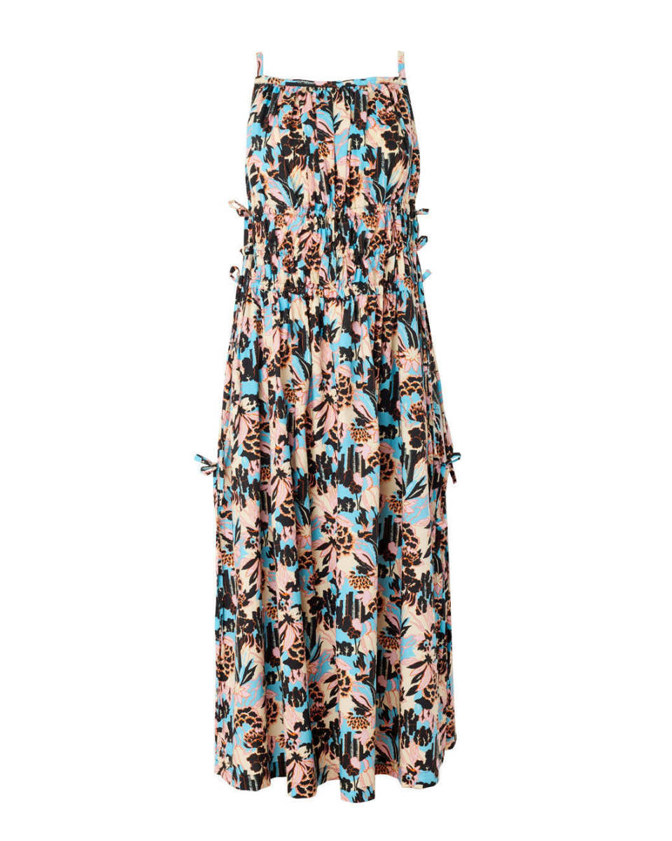 FINAL SALE The Marika Dress by Rachel Comey is a bold, printed dress featuring a high, square neckline, ruched detailing at the waist, and open side with adjustable self-ties. 100% Cotton Side slip pockets Made in USA 243W-623-C1800