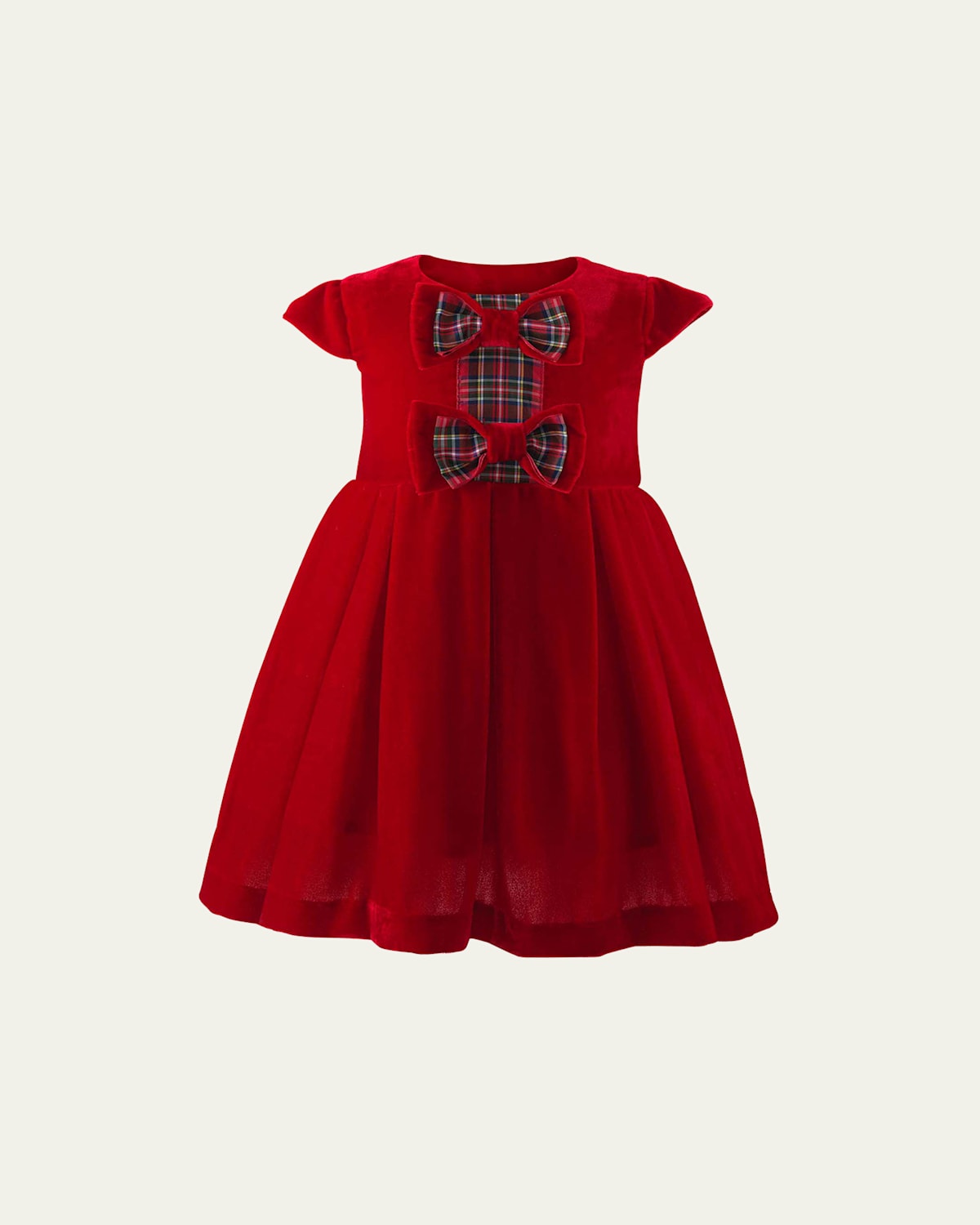Girl's Bow Velvet Holiday Tartan Bow Dress, Size 6M-24
