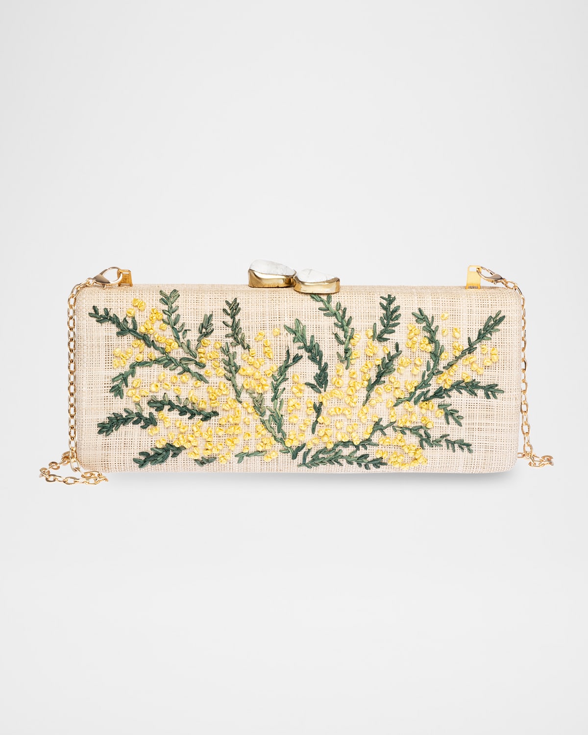 Rafe "Alessandra" long clutch bag in flower woven raffia Detachable chain shoulder strap, 23" drop Can be worn as a clutch or shoulder bag Framed top with kisslock closure Lining: Cotton Approx. 4.5"H x 9.3"W x 1.8"D Item Weight (Lbs.): 1.0 Imported